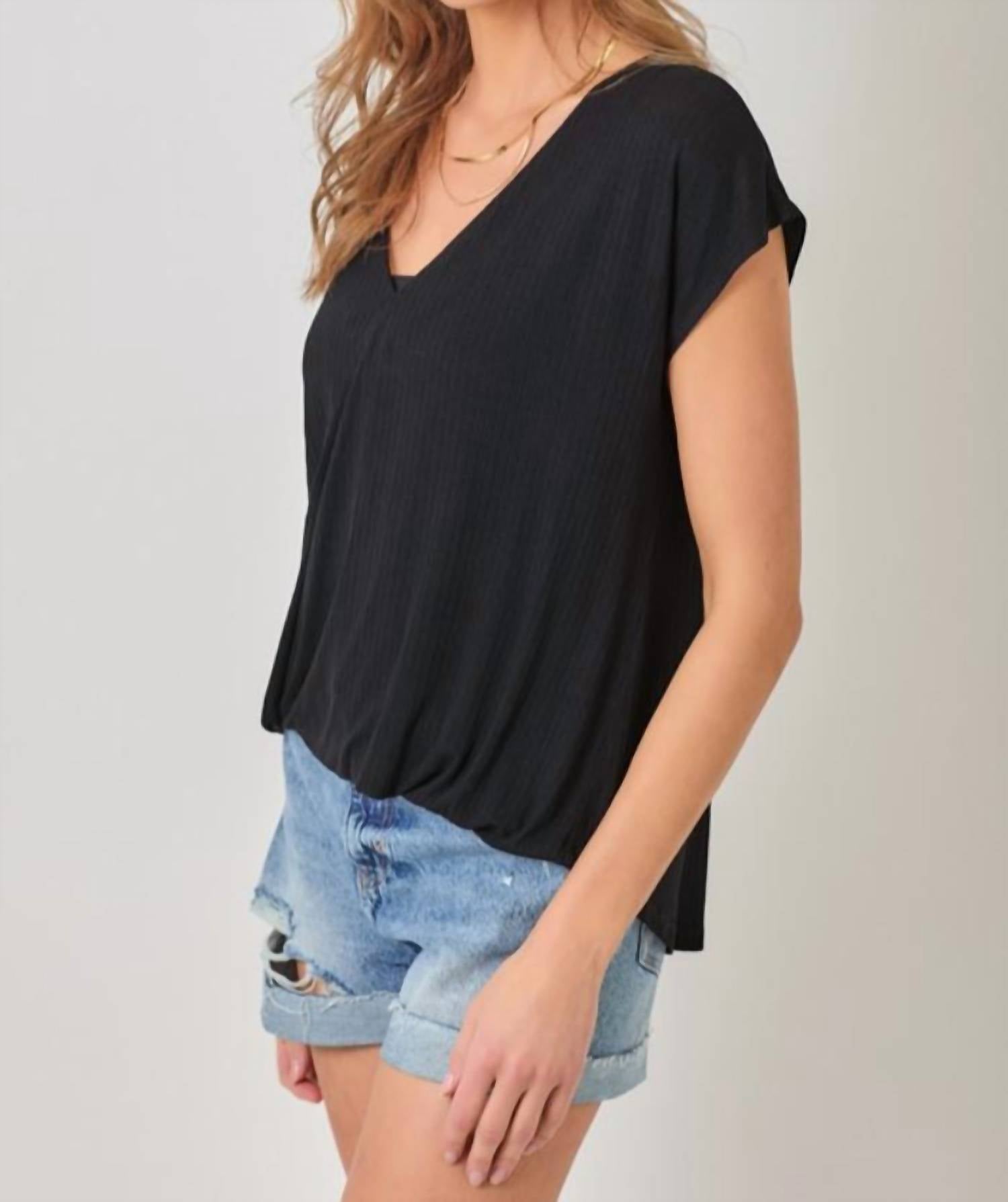 Pair this with your favorite jeans and slides for your next girls night out. Introducing the Surplice Neck Top by Mystree, a minimalist blouse available in elegant black. This versatile piece features short sleeves and is crafted from 92% Rayon and 8% Spandex, ensuring comfort and ease of movement. Closure: Pull on. Care: Machine wash for effortless maintenance. Ideal for a dinner party or a stylish addition to your Spring wardrobe.