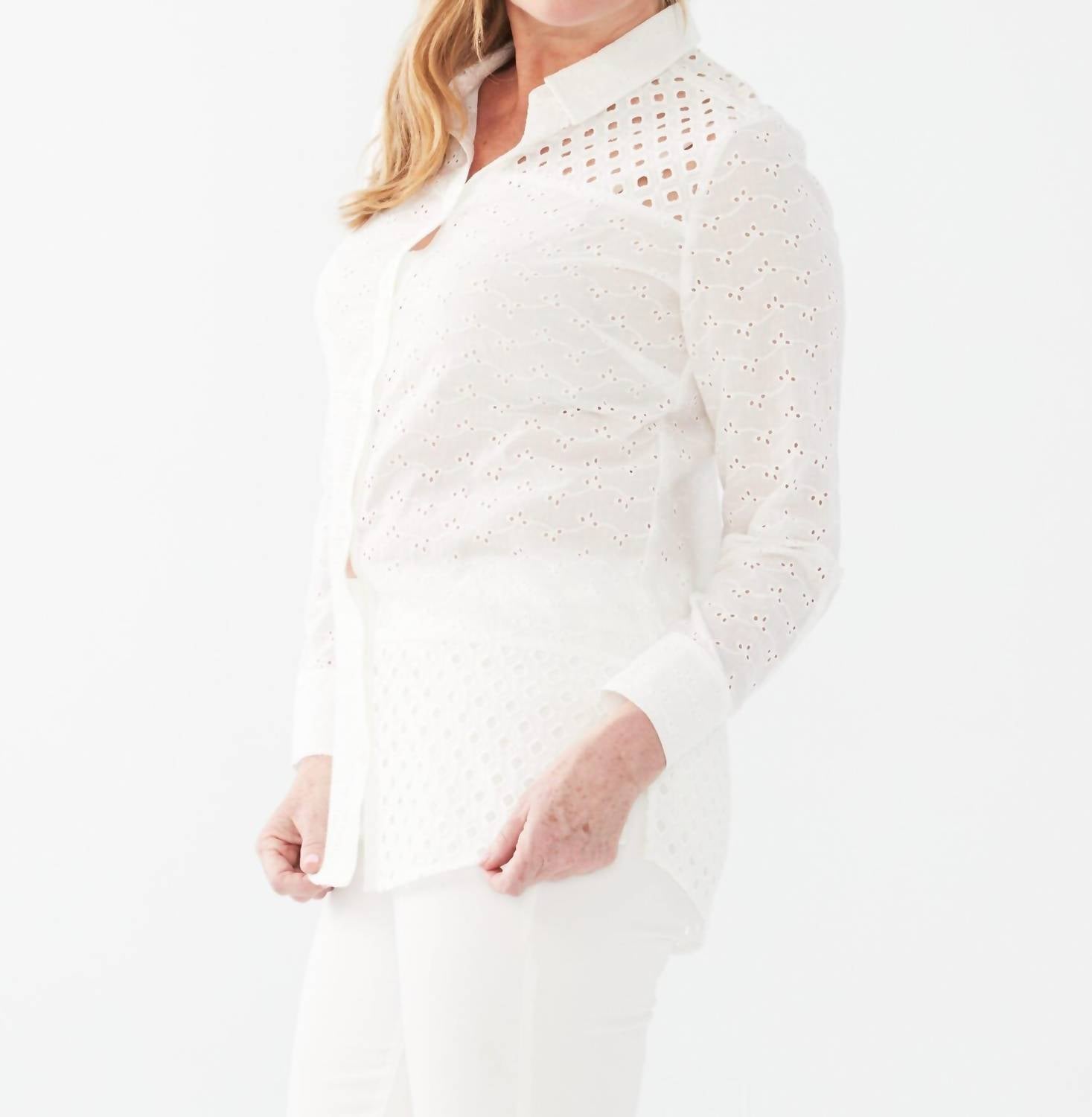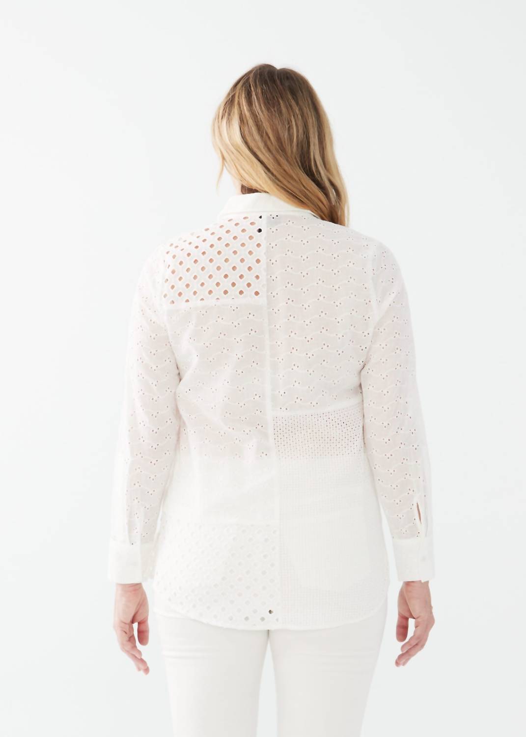 A perfect addition to any wardrobe, this classic tunic style blouse is flattering and effortless. You can easily transition from desk to dinner in this chic top. Embrace the bohemian spirit with the Patchwork Long Sleeve With Eyelets Tunic by FDJ, a perfect blend of refinement and intricate design. This 30" long tunic in crisp white features long sleeves and a classic round neck, adorned with elaborate patchwork and delicate eyelets. Composition: 100% Cotton. Closure: Front button closure. Ideal for Thanksgiving gatherings or a minimalist holiday party, this tunic offers a stylish yet comfortable choice.