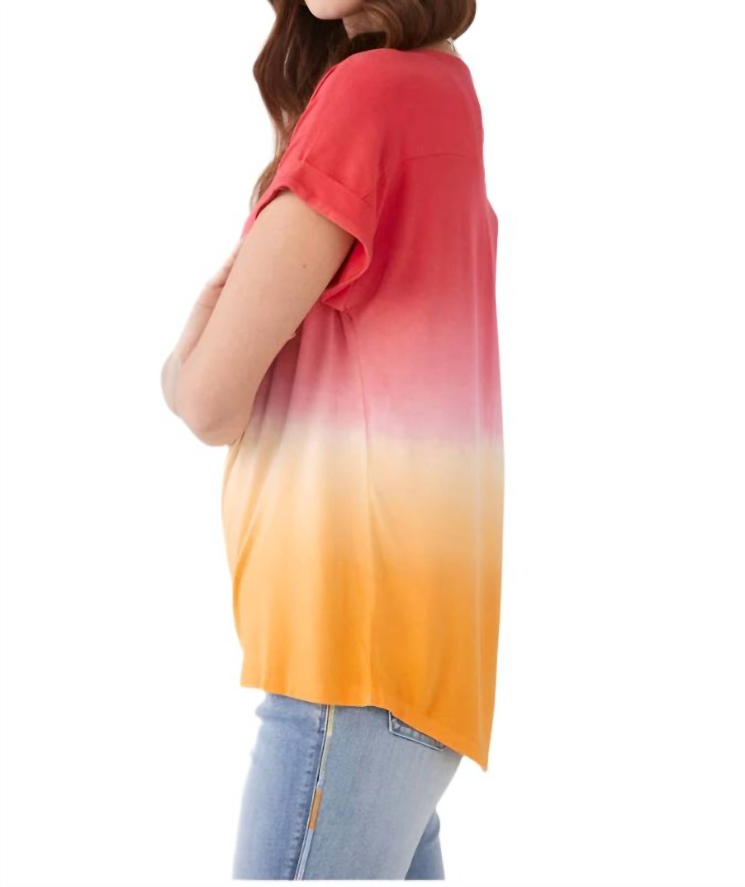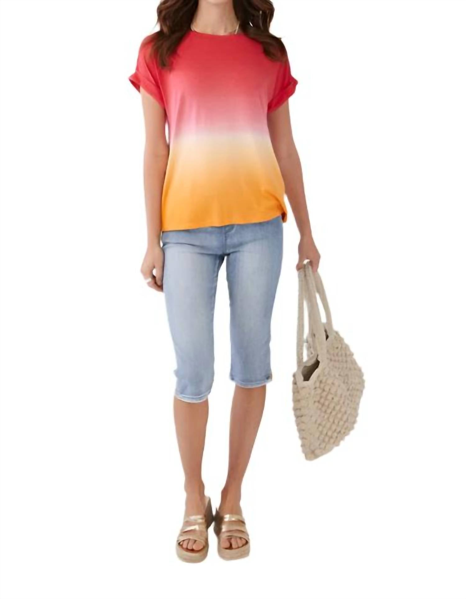 The short sleeve tee you'll want in every color. Elevate your festival wardrobe with the Ombre Short Sleeve Top by FDJ, featuring a stunning multi-color tie-dye pattern. This women's top comes in a soft viscose blend with a comfortable pull-on closure, perfect for sunny days. It showcases a boatneck design, capturing the essence of a sunrise or sunset effortlessly. Ideal for spring festivities, this piece combines style and comfort for any music festival occasion.
