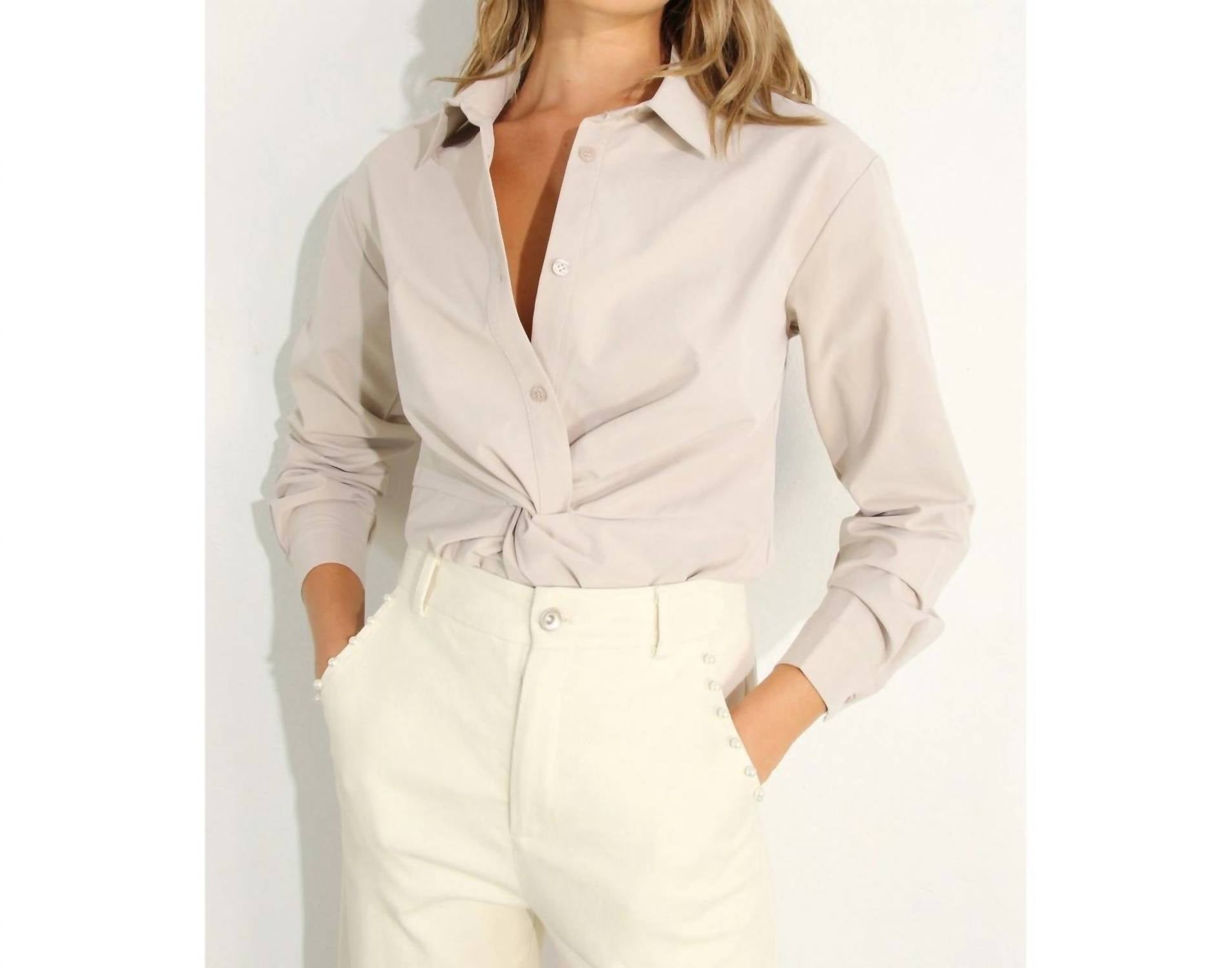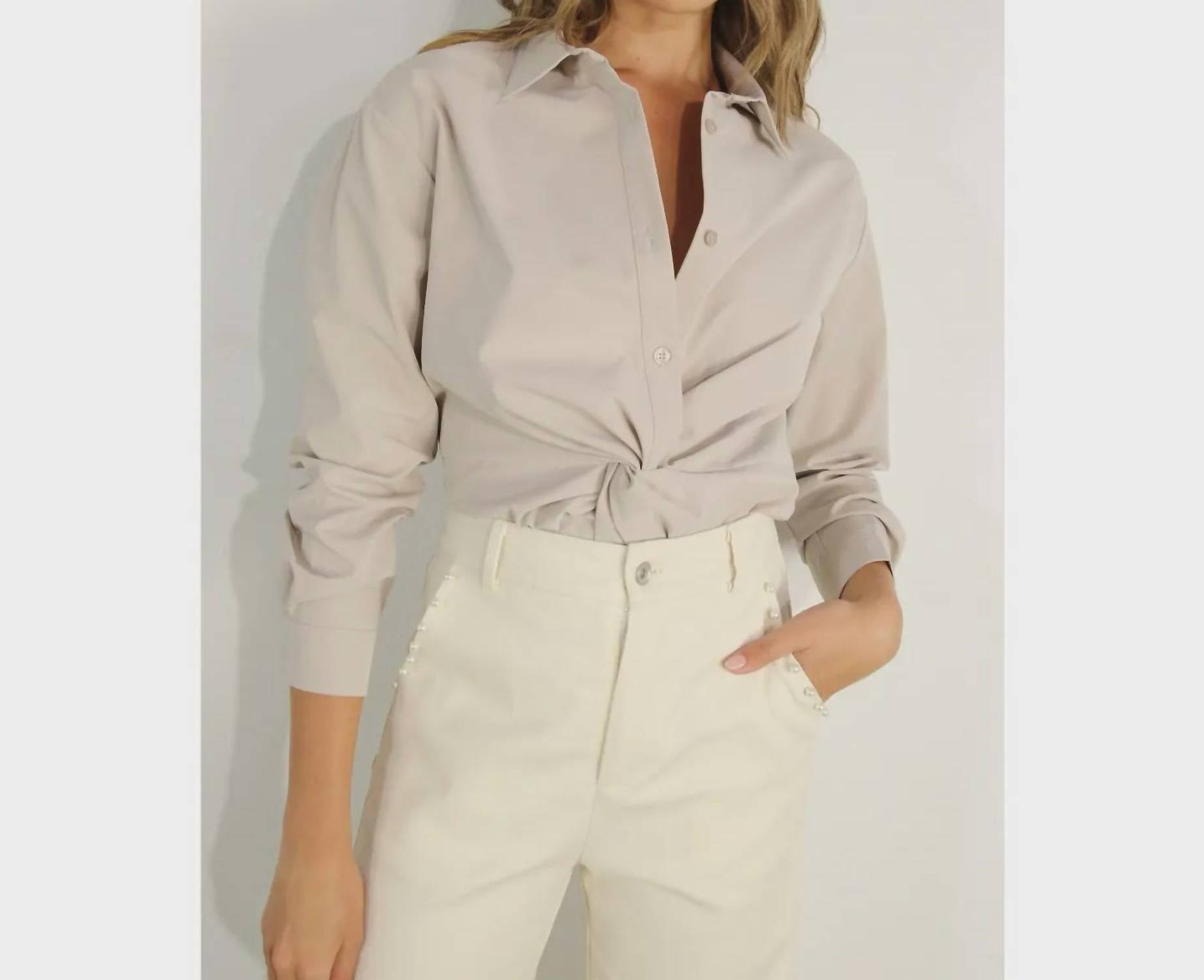 Perfectly tailored and soft to the touch. Introducing the Classic-with-a-twist Top by Mulla, a chic button-down shirt in a sophisticated stone hue. This women's shirt features long sleeves and a collar, crafted from lightweight Rayon for a minimalist and versatile look. Perfectly suited for fall, it seamlessly elevates outfits for dinner parties or holiday gatherings such as Thanksgiving.