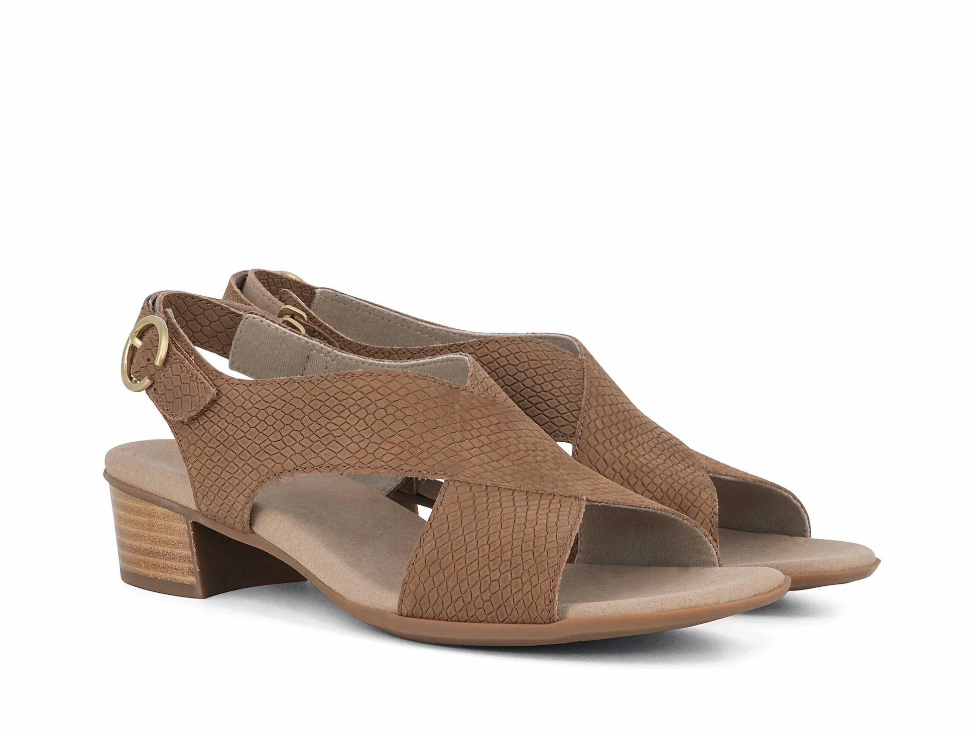 Flowy dresses, cropped pants, and even jumpsuits... this sandal works with them all! Introducing the Women's Jenny Sandal by Munro, perfect for making a statement at celebration destinations this summer. These sandals feature a stylish crossband with a hook & loop back strap in medium tan lizard print nubuck. Designed with a squared toe shape and a block heel, they ensure both comfort and style for evening events. The shock-absorbent latex rubber outsole, microfiber lining, and riveted steel shank offer flexibility and stability, making them an ideal choice for spring outings.