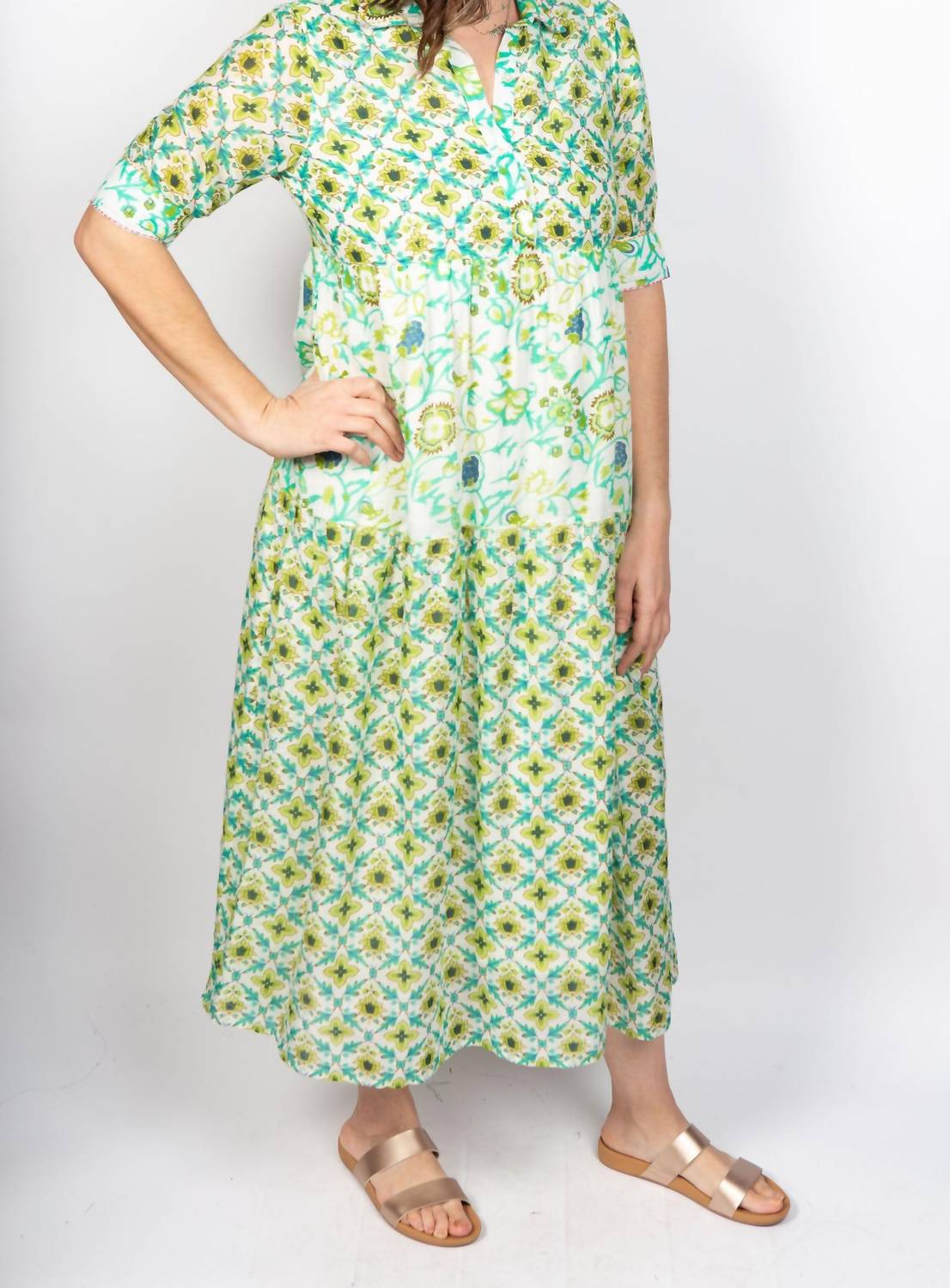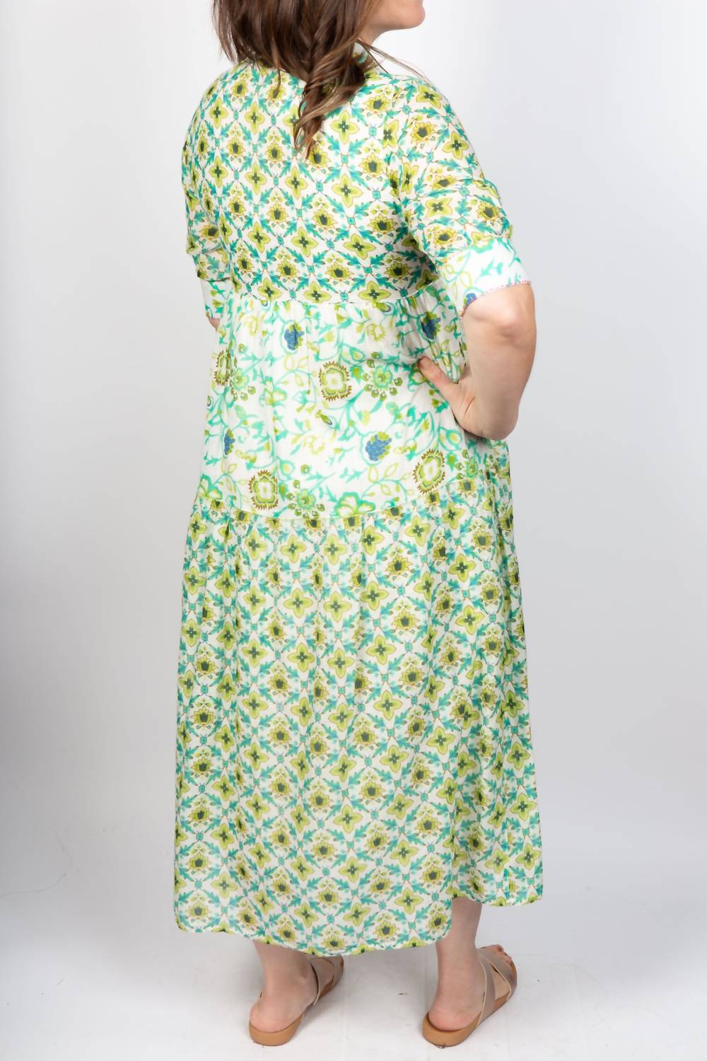 This charming piece features elbow sleeves and is crafted from 100% cotton, perfect for graceful movement in an A-line silhouette. Adorned with a floral print and embroidered stitching detail around the neck and sleeves, this dress is made in India with a convenient button closure. Machine wash instructions.
