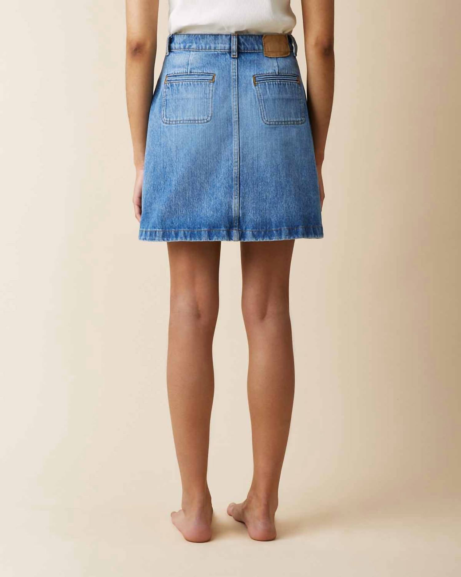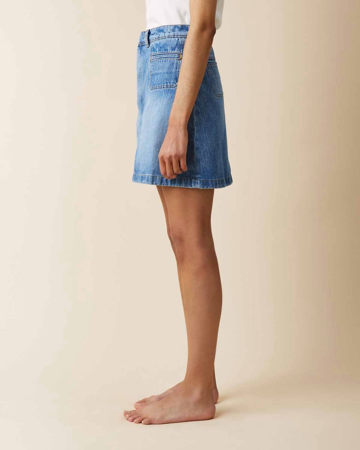 Tuck in your favorite tee for a more laid-back vibe. silhouette with a gently fluted A-line shape. Featuring a button fly, jetted pockets and an asymmetrical front closure that imbues a modern sensibility. Made in rigid blue denim with more than 50% recycled content, treated for a vintage stone-wash look with high and low tones. Finished with classic tobacco stitching.Composition: 46% cotton, 46% recycled cotton, 8% recycled polyester.High-waist.Thigh-length.Button fly.Jetted pockets.Asymmetrical front closure.Model is 175 cm/5'9” and wears waist 26.