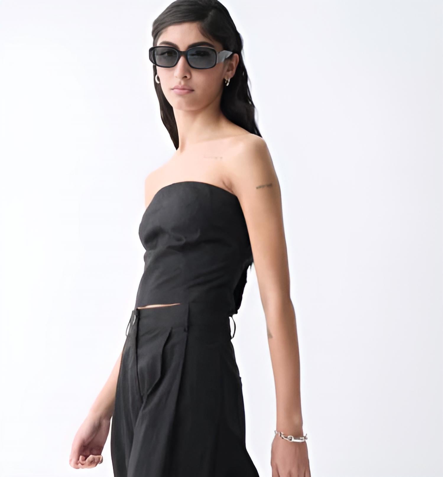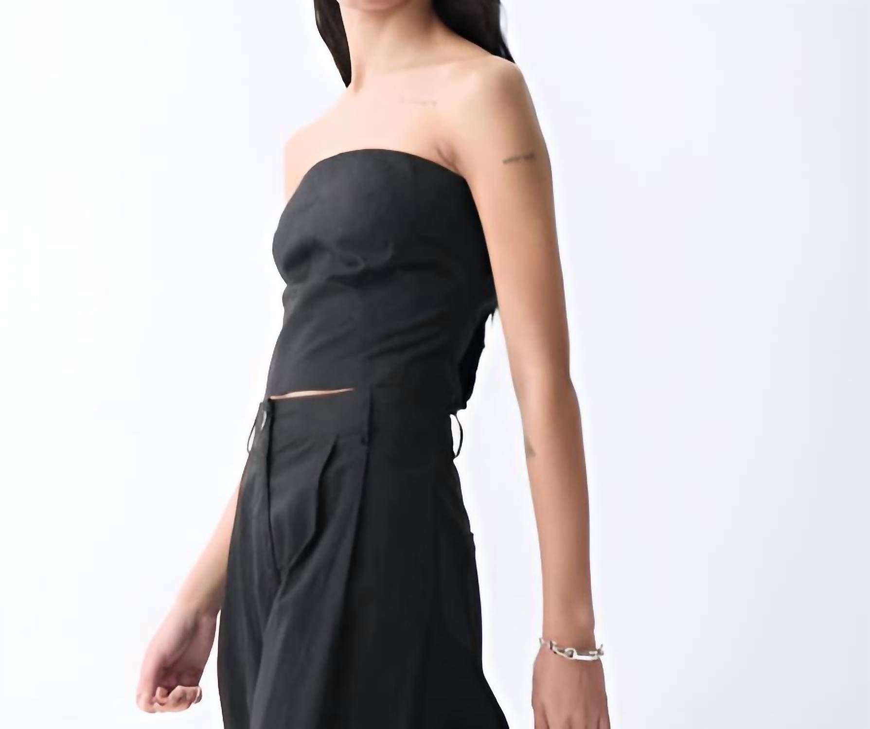 Pair this crop top with your favorite high-waisted jeans or maxi skirt. Elevate your wardrobe with the DELUC Louna Top, a stunning strapless black top designed to enhance any outfit with its sleek and solid pattern. Offering a modern edge to this form-fitting piece, it is ideal for showcasing your silhouette. Perfect for various occasions, this top adds a touch of sophistication and style to your collection.