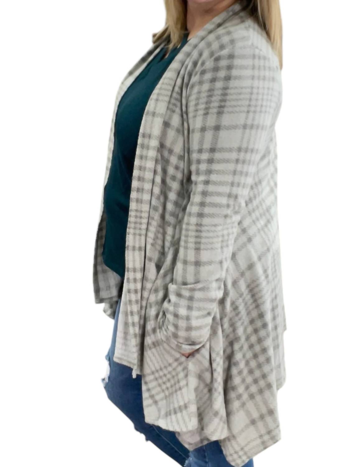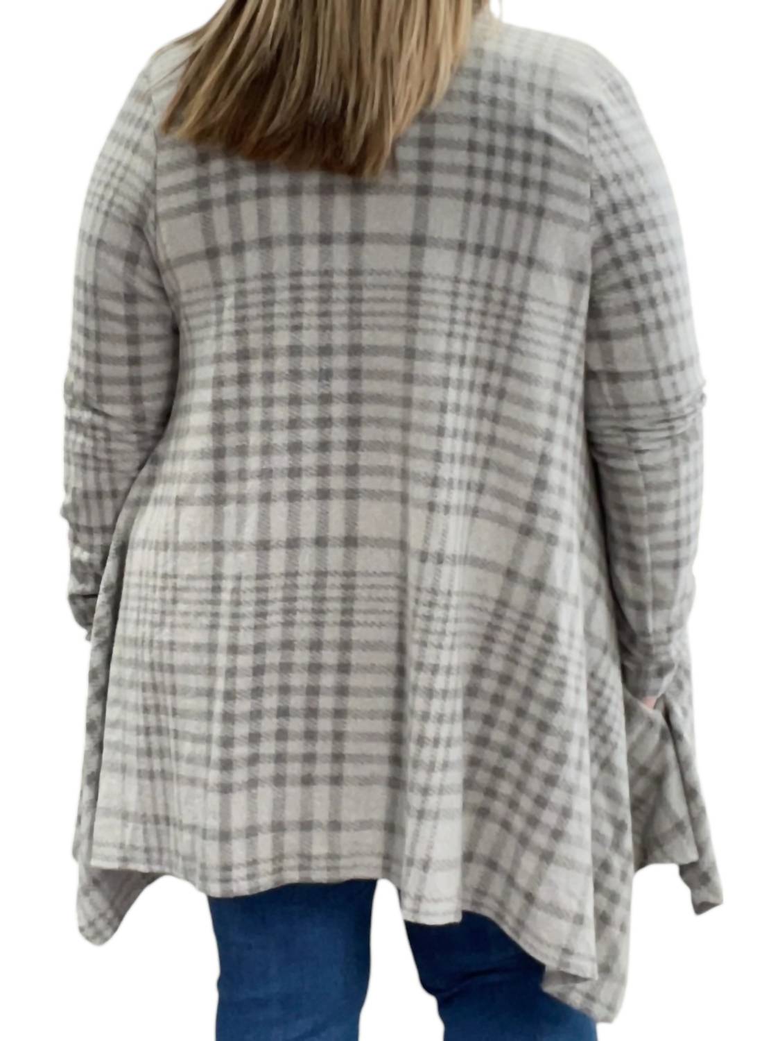 Open front. Long sleeves. Plaid. Pocket. 63% Polyester 34% Rayon 3% Spandex. Machine wash cold.