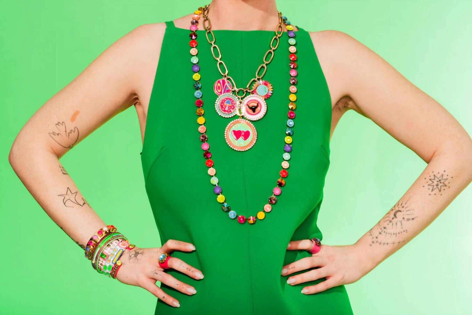 The perfect stand-out necklace that complements even the most basic t-shirt. Introducing the Women's Together Forever Necklace by TOVA, a striking piece that brings personality and charm to your jewelry collection. Crafted with an antique gold plated brass base metal, this necklace features high quality crystals and hand-painted enamel for a touch of glam. It measures 18" in length with a 4" drop and a 4" extension, ensuring a versatile fit. This stylish necklace is proudly designed and made in Canada.