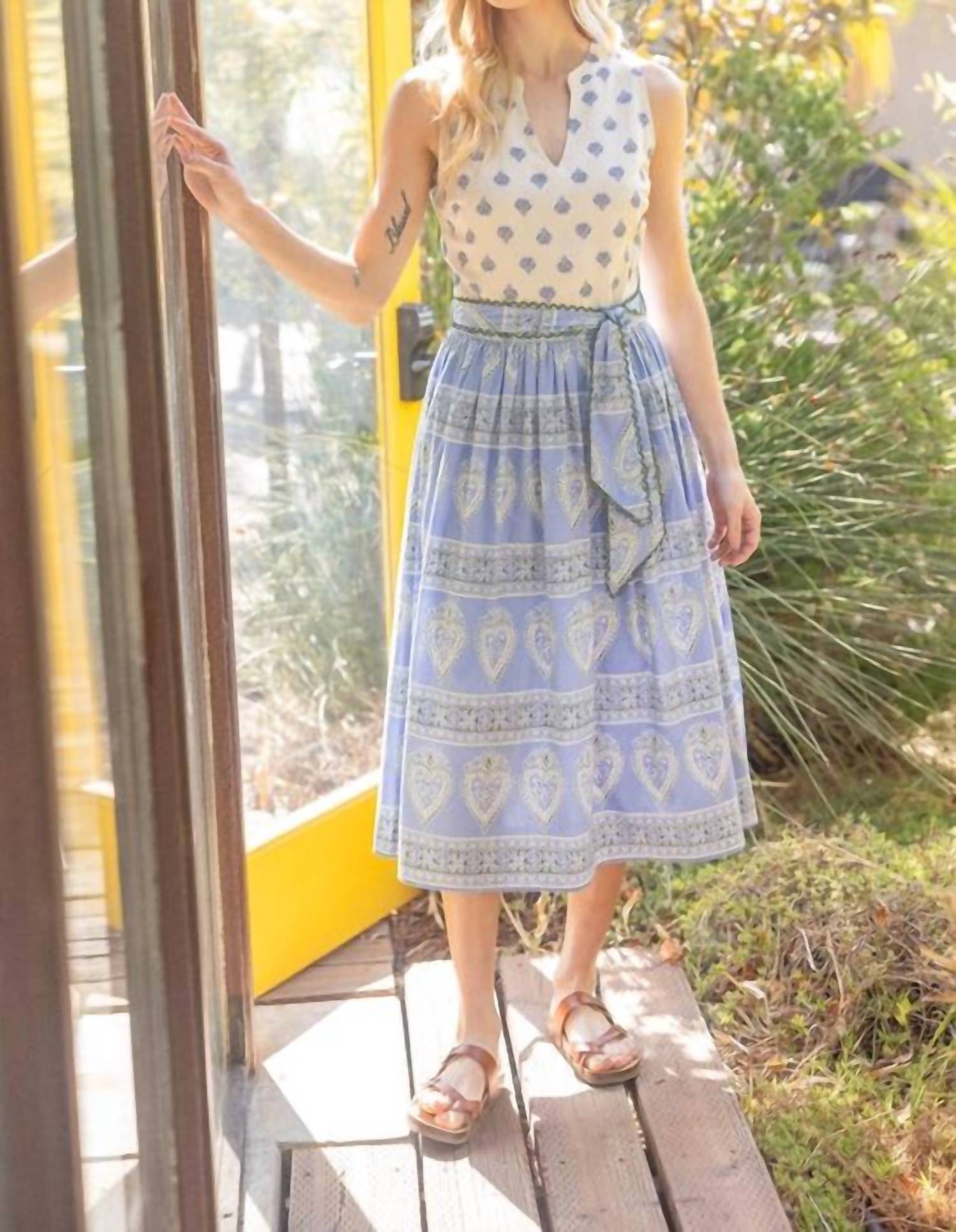 A midi dress so versatile, your options for wearing it are endless. Embrace sophistication with the Mixed Print Sleeveless Midi Dress by Voy, a stunning choice in slate blue designed for timeless elegance. This dress features a sleeveless, tailored A-line silhouette with a notch neckline and a unique color block cream bodice. Crafted from a viscose blend, the ornate mixed print and scalloped edge tie waist detail create a flattering and unique look. Care: Hand wash cold, do not bleach, hang to dry, and dry clean for best results. Available in sizes small, medium, and large.