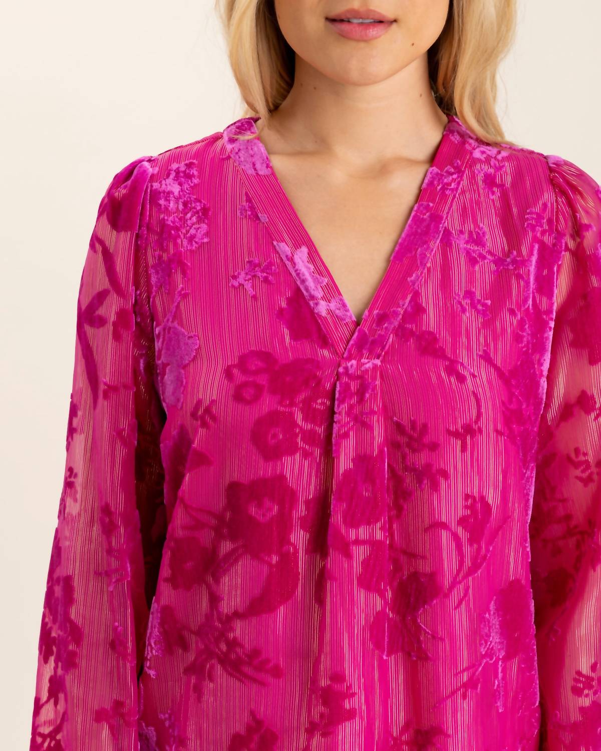 A versatile blouse that works from desk to dinner! This long sleeve top features a flattering V-neckline complemented by delicate gold thread detailing, offering a touch of luxury. It boasts a convenient pull-on closure. Dy clean and lay flat to dry.