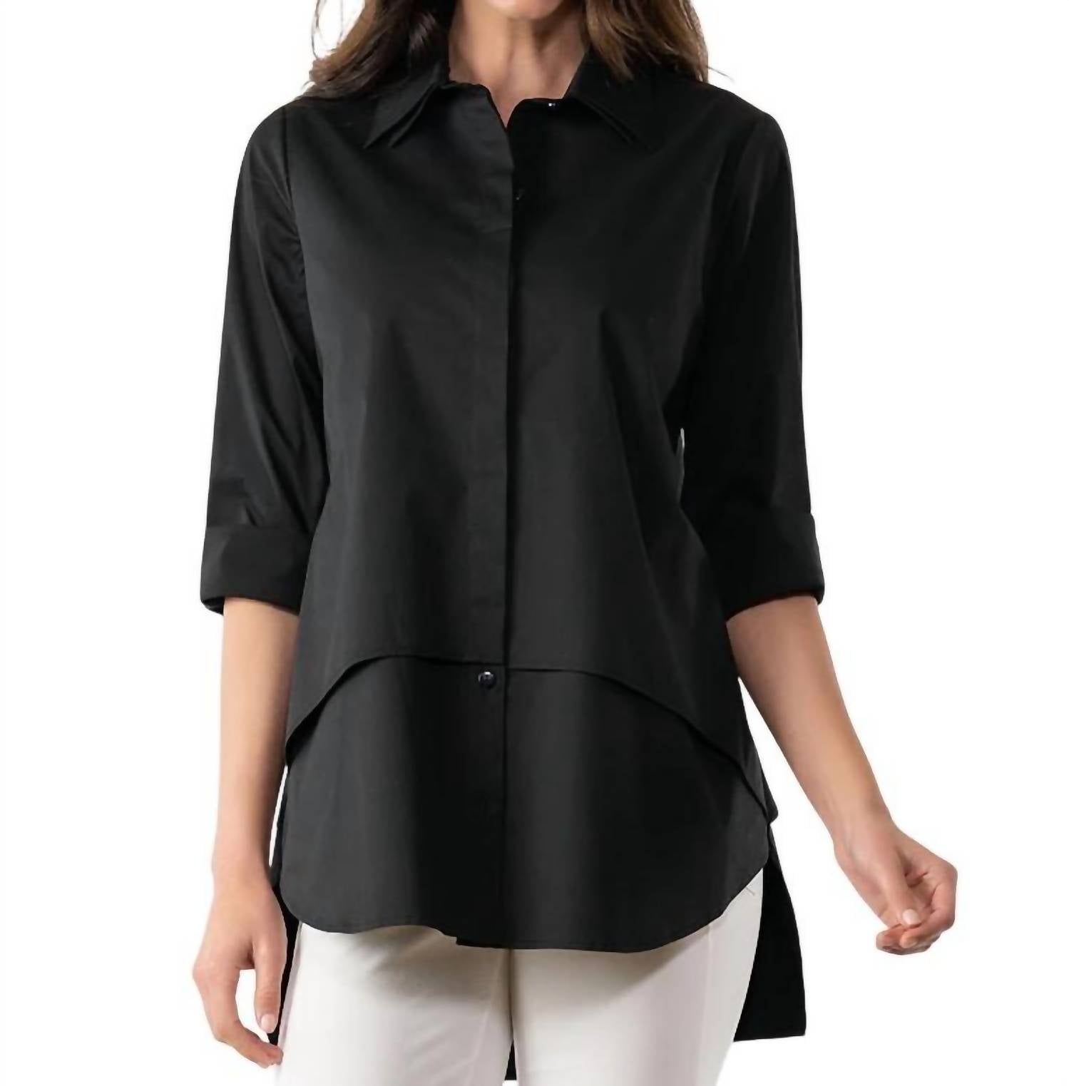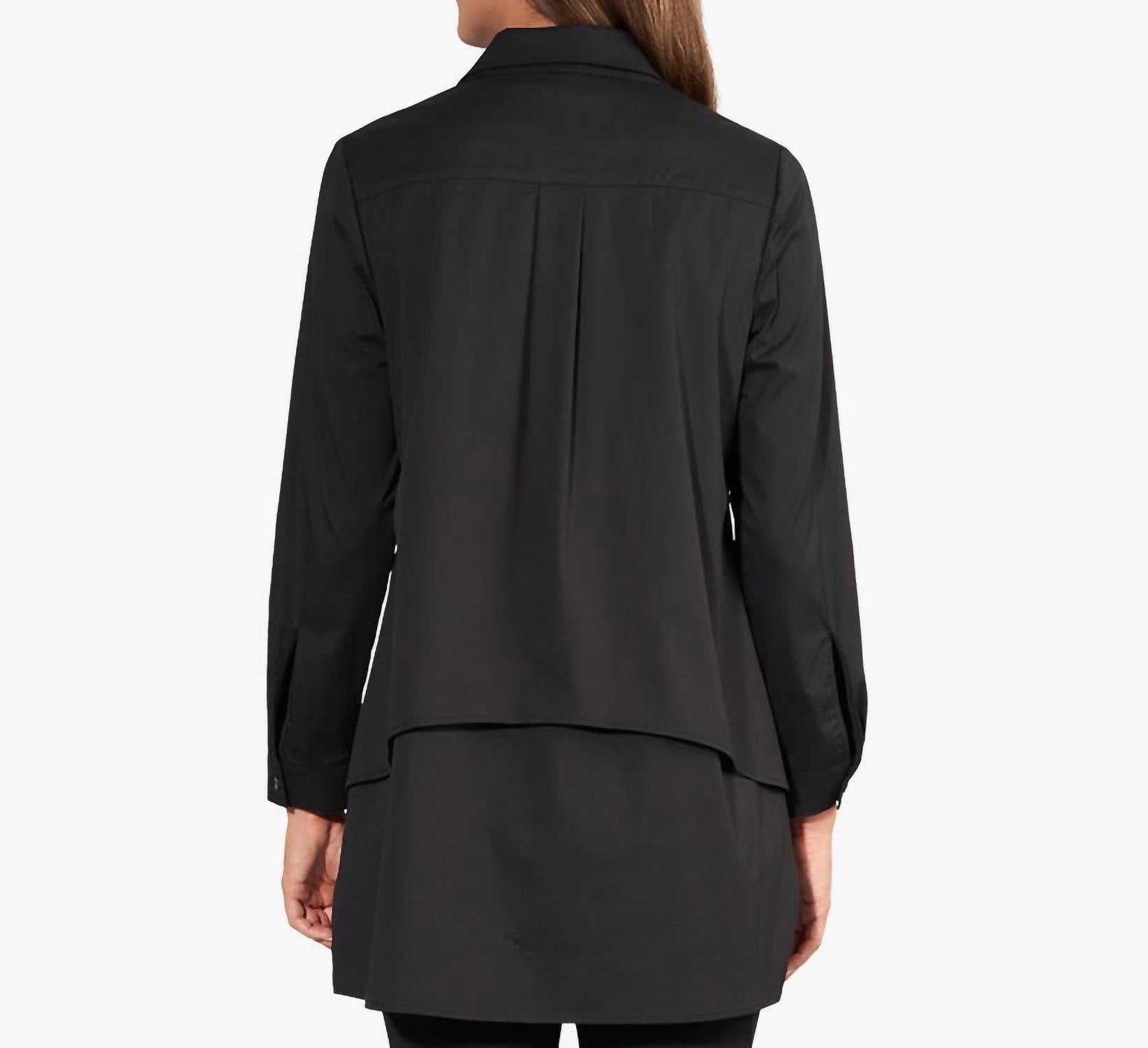 Unique double layer, stretch poplin shirt with pockets. 61% Organic Cotton / 34% Nylon / 5% Spandex. Imported. Machine Wash.