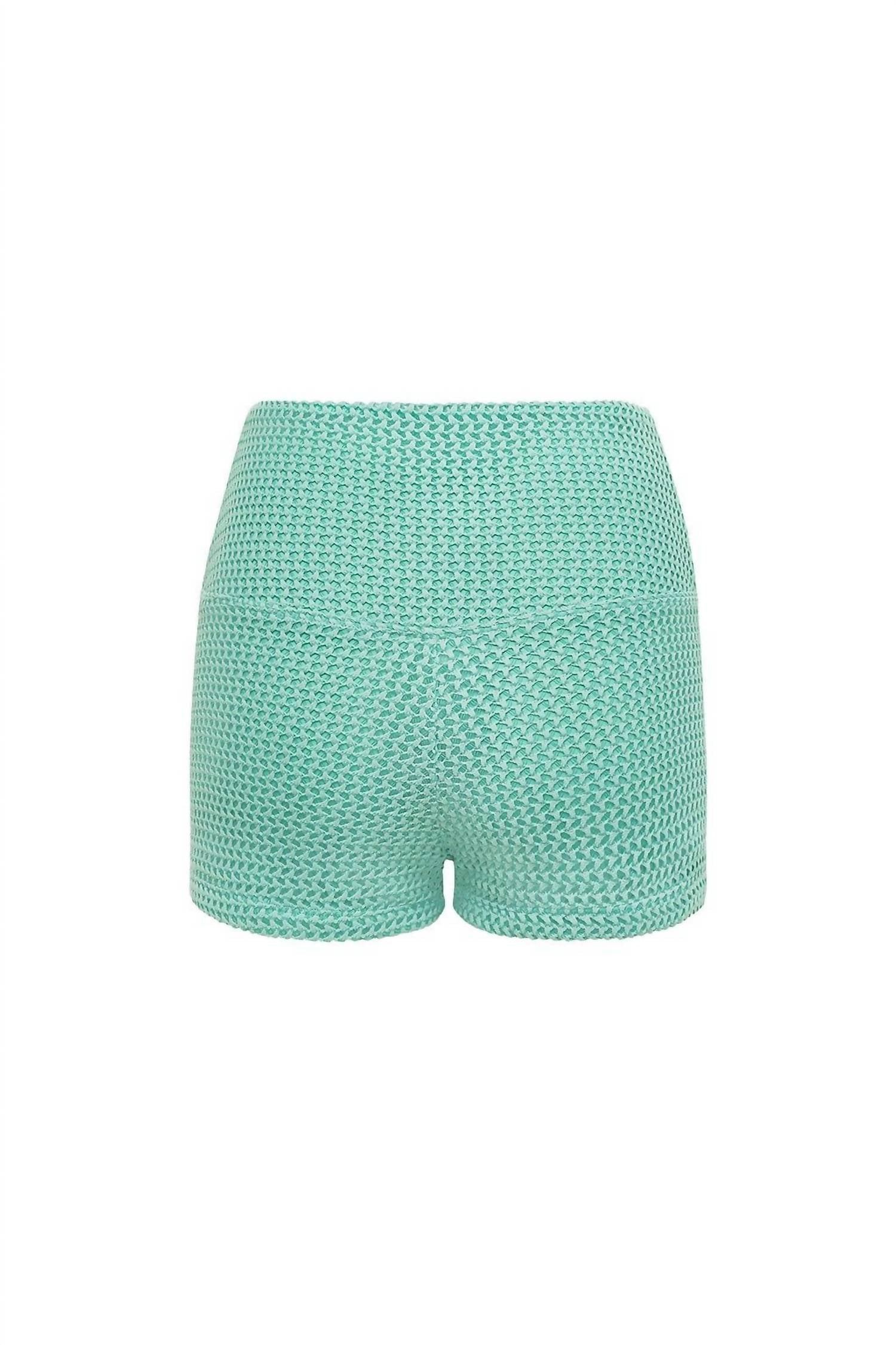 Pair these with an oversized tee for the ultimate cool-girl vibe. Introducing the Montce Crochet Micro Bike Short, a stylish and versatile piece in vibrant turquoise. These high-rise shorts feature a 2” inseam, light compression, and a wide, contouring waistband, perfect for loungewear, light exercise, or streetwear. With a textured pattern and flat locked seams for extra comfort, these shorts can also double as swim bottoms. Closure: Pull-on. Care: Hand wash.