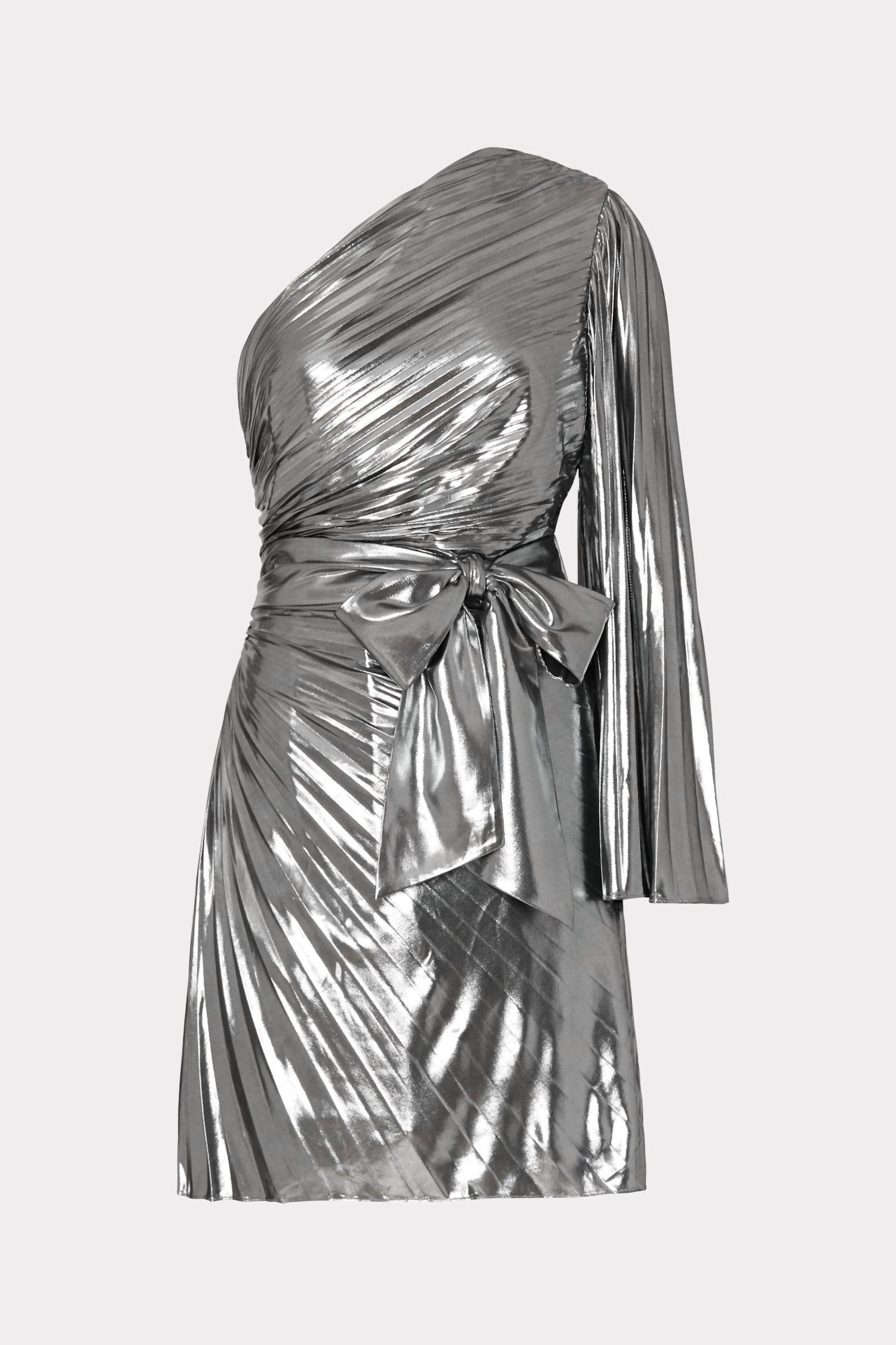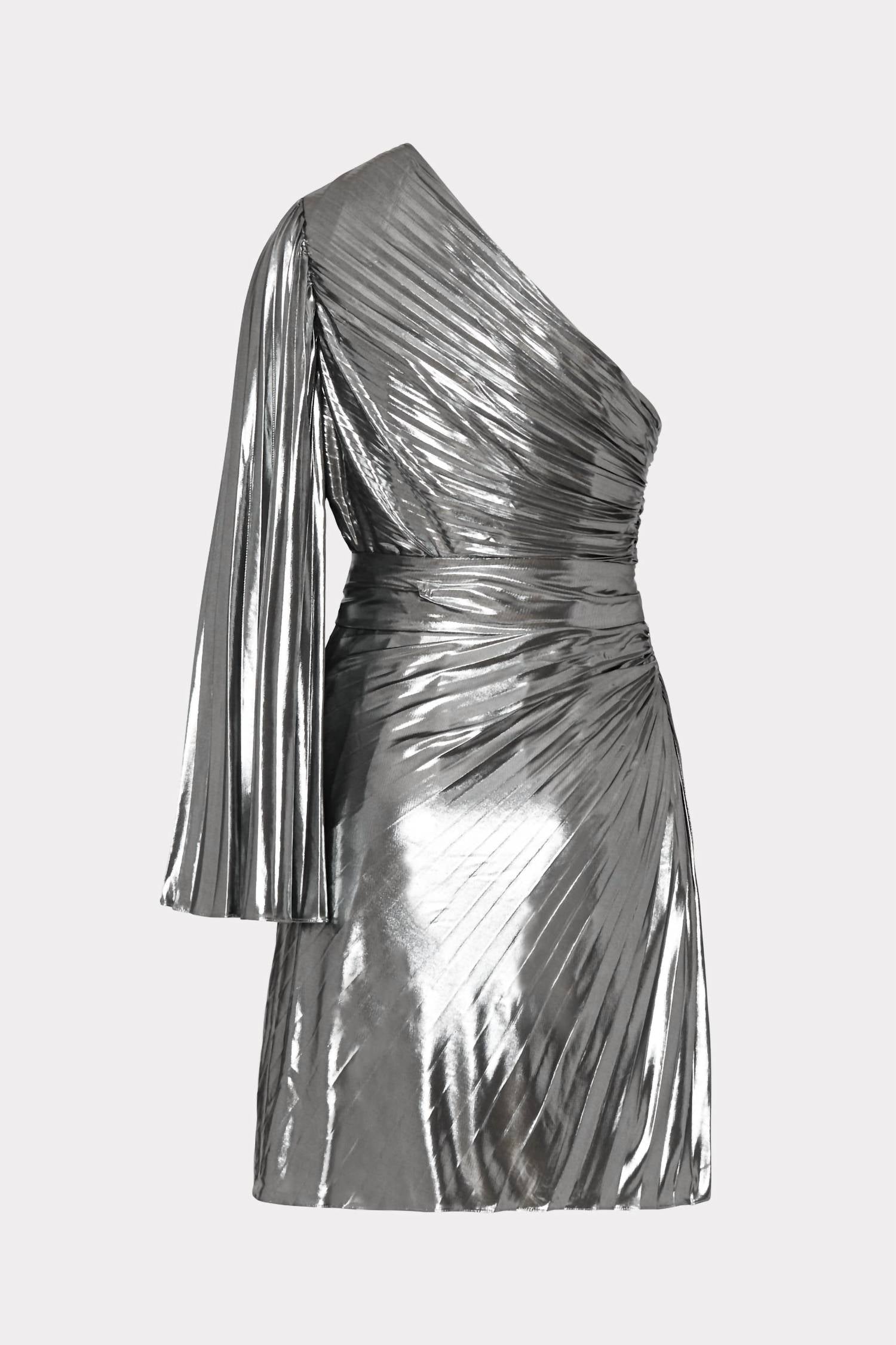 Mini Dress. One shoulder. Dramatic long sleeve. Metallic lame pleated fabric. Tie at waist. Side Zipper. Lined body. 95% Polyester, 5% Spandex. Dry Clean Only. Runs small, suggest to size up. Model is 5’10" and is wearing a size Small. Measurements: Approx 36" in length from shoulder to hem for a size Small.