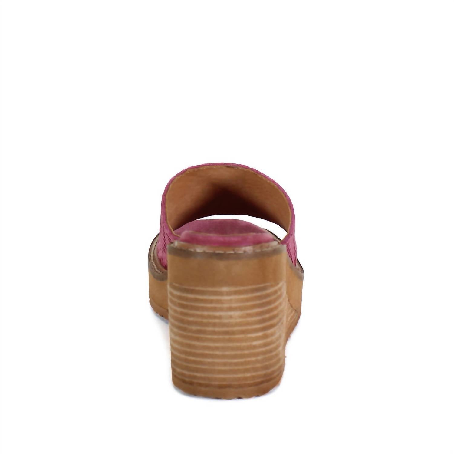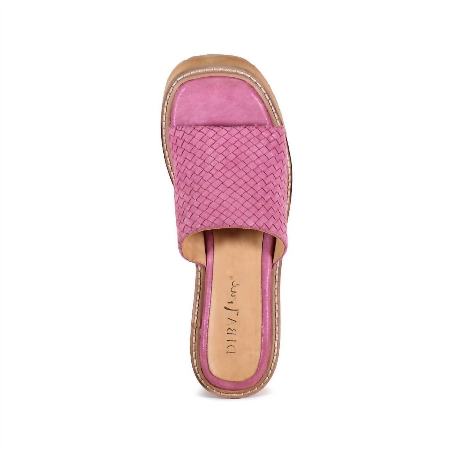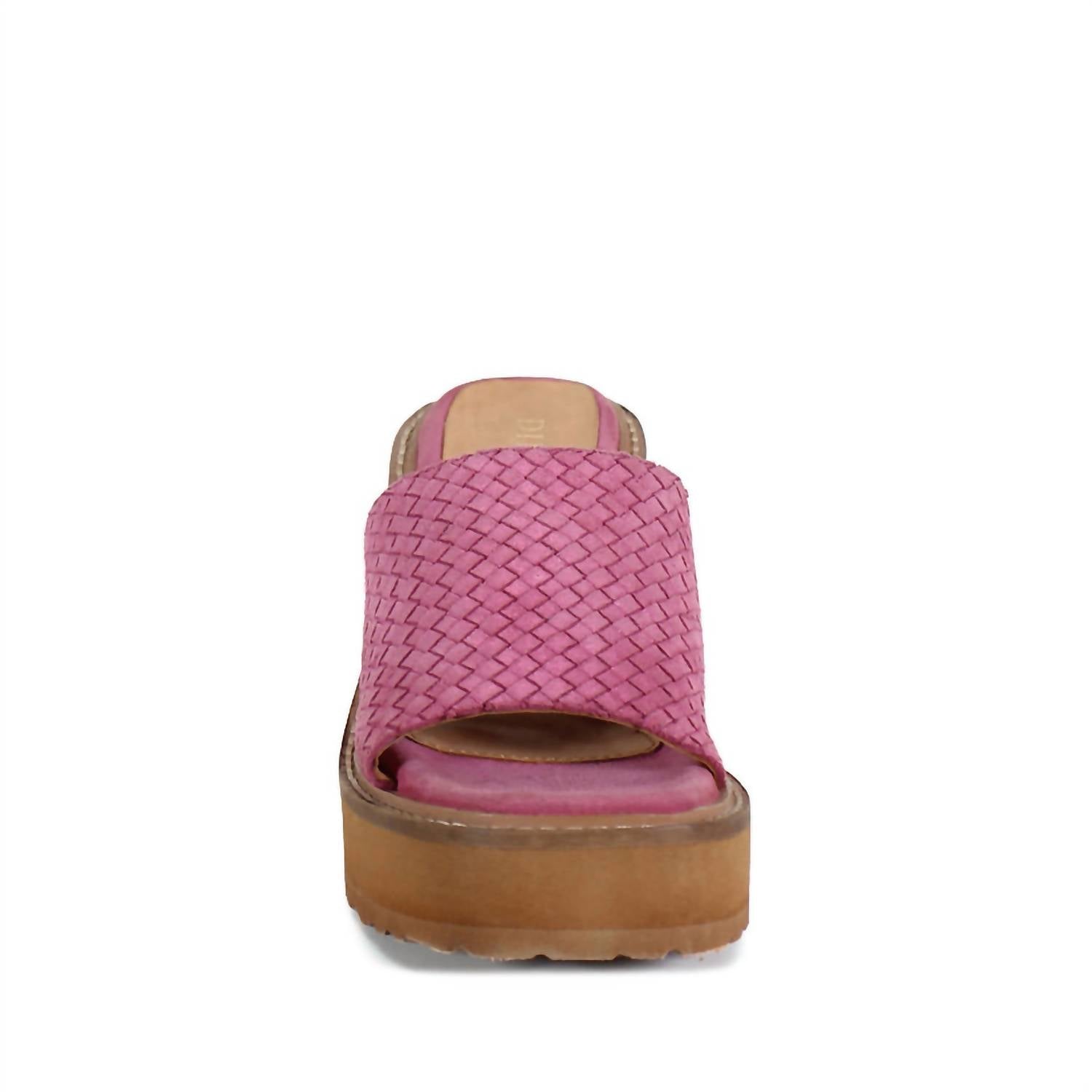 Introducing the Women's Stare Down Wedge Sandal by DIBA True, a bold addition to your shoe collection. Featuring a striking metallic pink hue, these wedges elevate every ensemble with a 3.25-inch platform wedge heel and a squared toe shape. The genuine suede woven upper and plush insole ensure comfort and style, complementing their high heel height. Made for adults and available in whole and half sizes from 6 to 11, these sandals fit true to size.