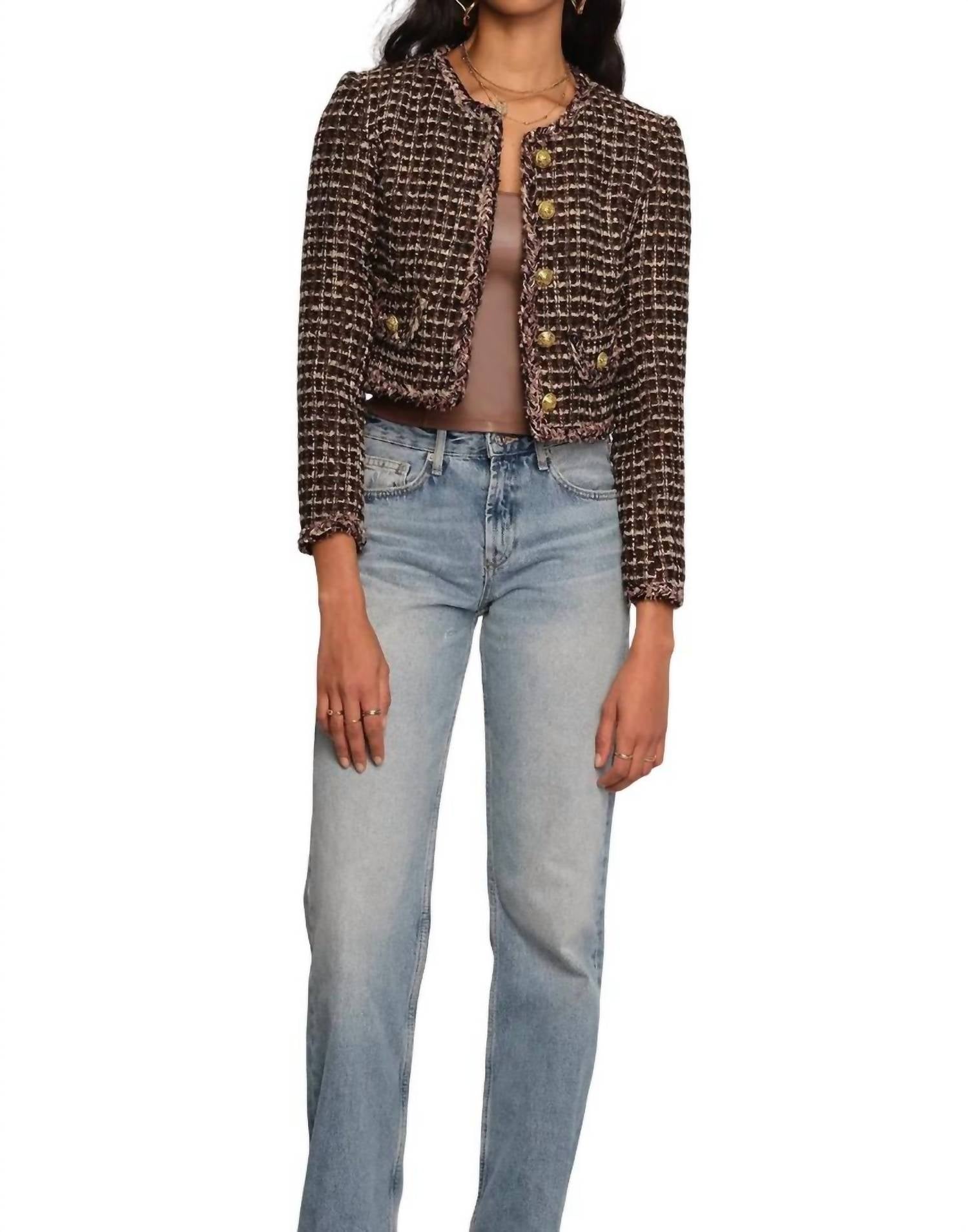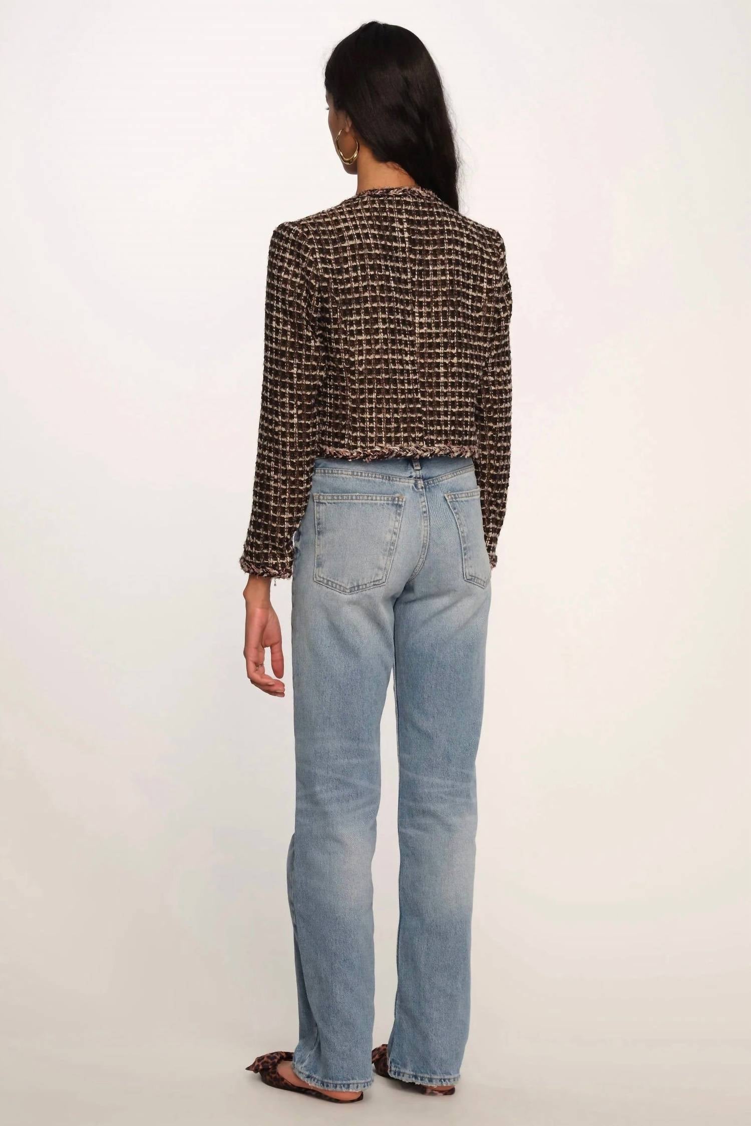 Textured boucle. Slim fit, novelty buttons and self braided trim around the edges. 100% Polyester. Import. Length: 20.5" from high point of shoulder. Measurements from Size S.