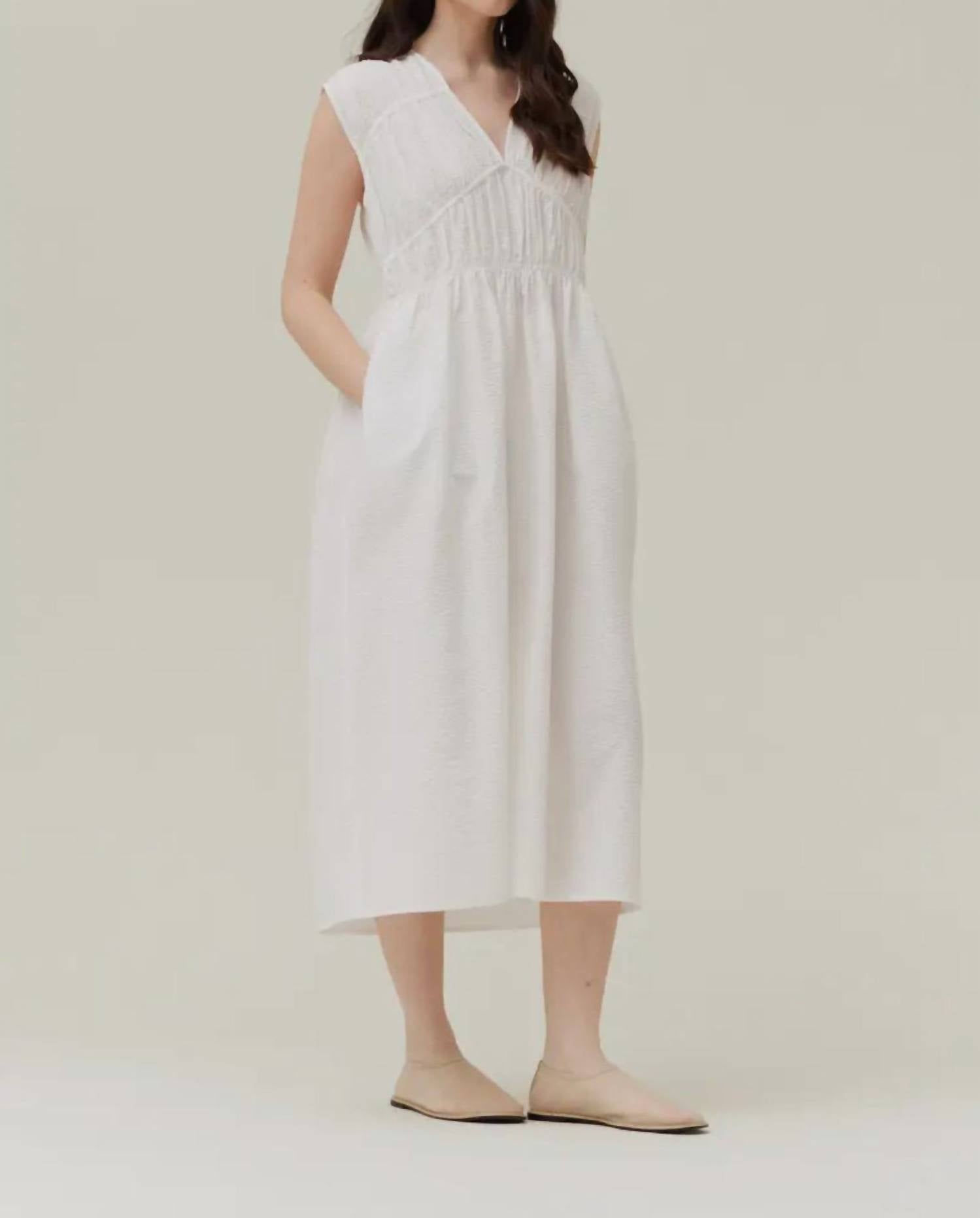 A midi dress so versatile, your options for wearing it are endless. Introducing the Seersucker Midi Dress by Grade & Gather, a chic choice in solid black for women seeking effortless elegance. This sleeveless A-line dress is crafted from 100% cotton, providing a comfortable fit with a stylish V-neckline. Enjoy the convenience of side pockets and a pull-on closure for ease of wear. Care: Machine wash and lay flat to dry.