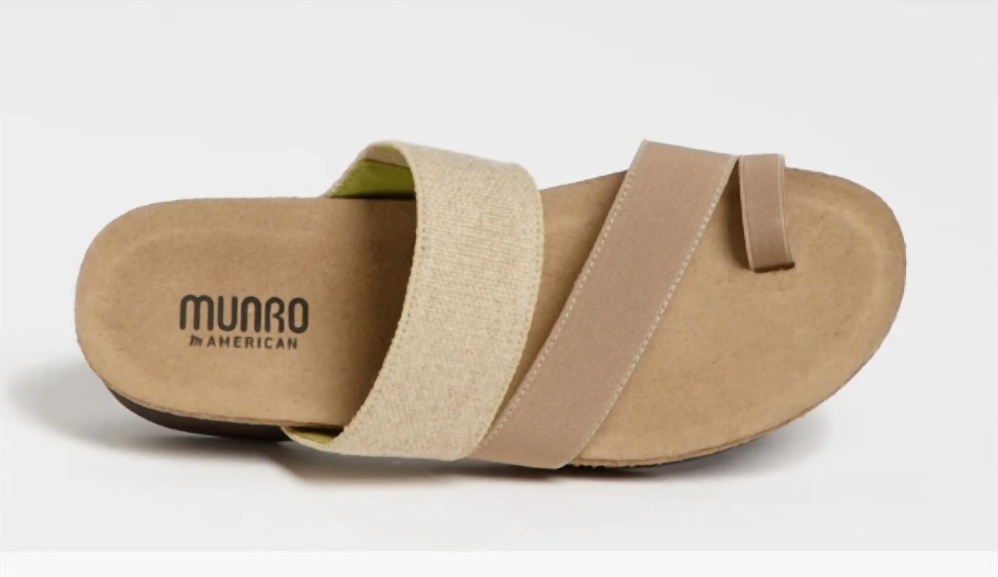 Classicly cute and all-day-wearable. We love this sandal. Experience unparalleled comfort with the Women's Aries Sandals by Munro, crafted in a stylish natural tone. These premium sandals feature an asymmetrical vamp strap and elastic toe ring for a perfect fit, complemented by a wedge heel with a height of 0.5 inches. Constructed with an ultra-lightweight molded EVA outsole and a contoured footbed with a suede cover, combining latex and sustainable cork from Portugal for a shock-absorbent wear. Imported and designed for immediate comfort with no break-in necessary, these sandals effortlessly blend functionality with trendsetting Y2K aesthetics.