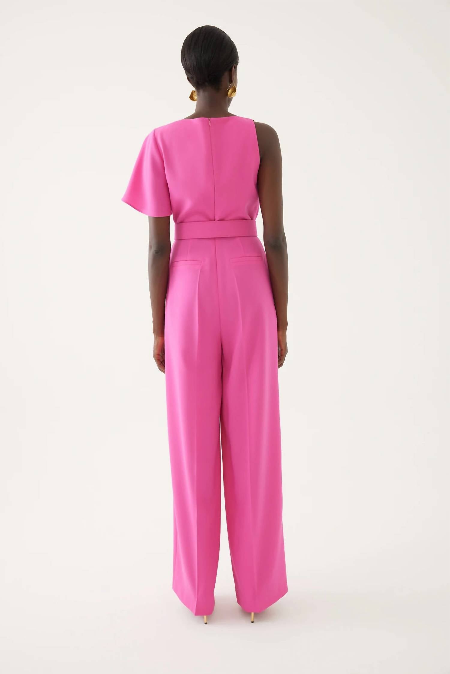 This Show Stopping Pink Jumpsuit features one shoulder detail of a circular chain strap, waist enhancing fabric belt and flair pant.