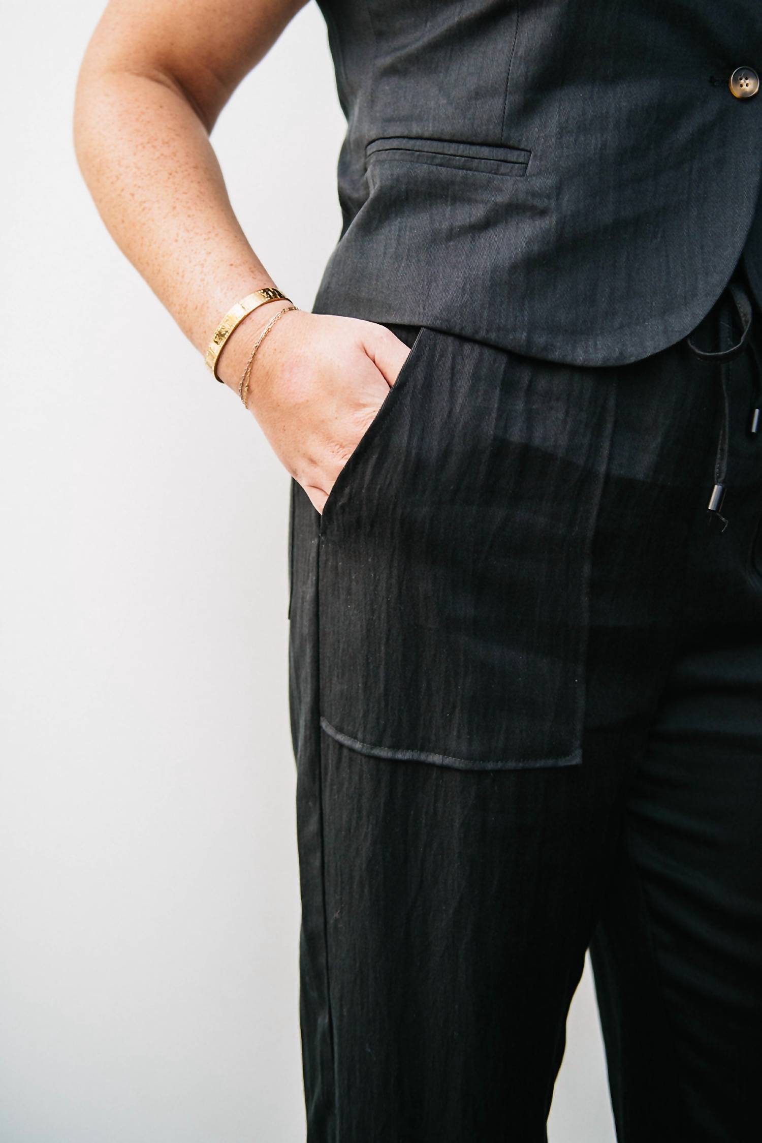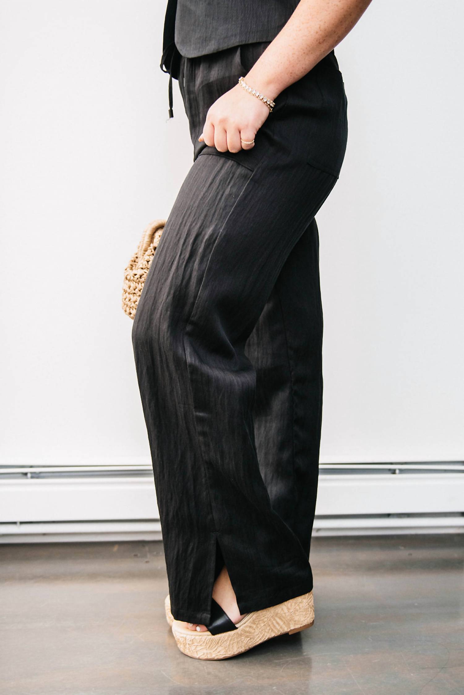 Introducing the Women's Split Hem Pant by DELUC, where relaxed tailoring meets everyday comfort. Crafted with an elastic waistband and adjustable drawstrings, these Tencel blend wide-leg pants provide an effortless, flattering fit with back darts and a 29" inseam. Stylish utility is enhanced with front and back patch pockets and split hems, making them a perfect companion for a monochrome vacation look. Closure: Pull on.