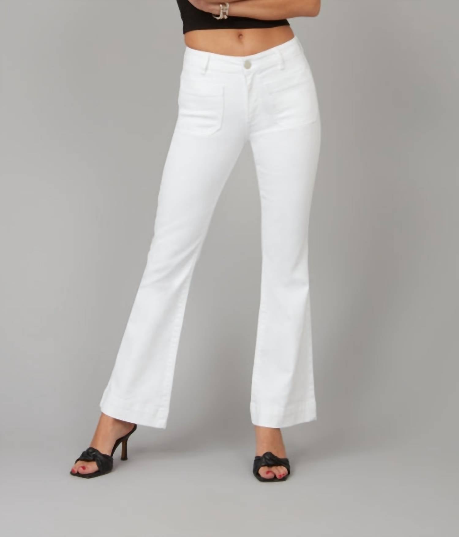 Just as cute as they are comfortable. Introducing the White Alice Flare Jeans by LOLA JEANS, your new go-to for effortless style. These mid-rise jeans boast a flattering, slim fit with a flared leg and a 31" inseam, making them a must-have for any occasion. Crafted from a cotton blend, they feature a solid pattern, front pockets, and a button closure. Embrace comfort and minimalist fashion in these jeans, perfect for holiday parties and spring outings.