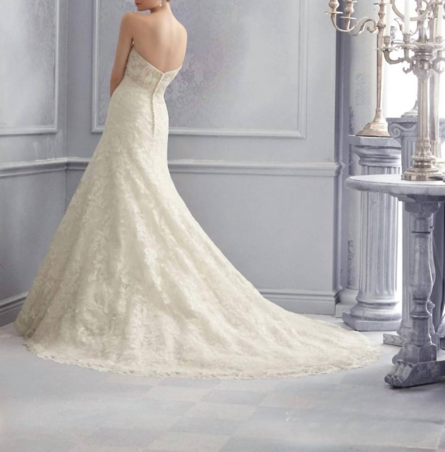 Designed for the bride who values understated elegance. Its classic design and perfect fit make it the ideal choice for your special day. Say yes to the dress! Introducing the A-line Sweetheart Bridal Dress by MORILEE, an elegant choice for the modern bride. This ivory dress features a strapless neckline with a stunning crys bodice enhancing its timeless appeal. The solid pattern and off-the-shoulder design exude quiet luxury. Zip closure. Perfect for making your big day unforgettable.