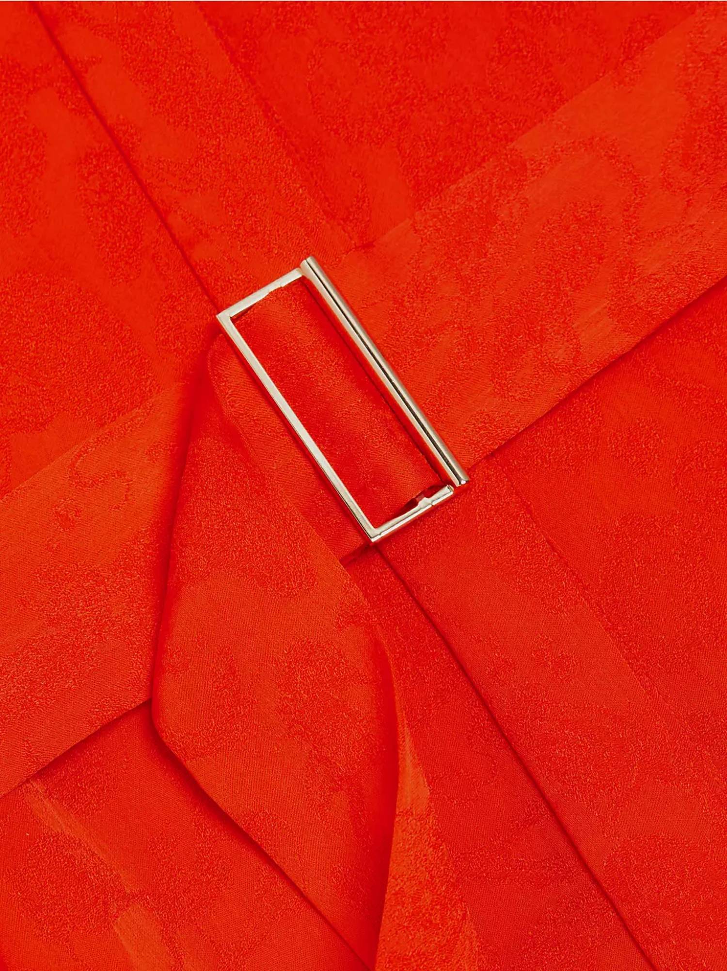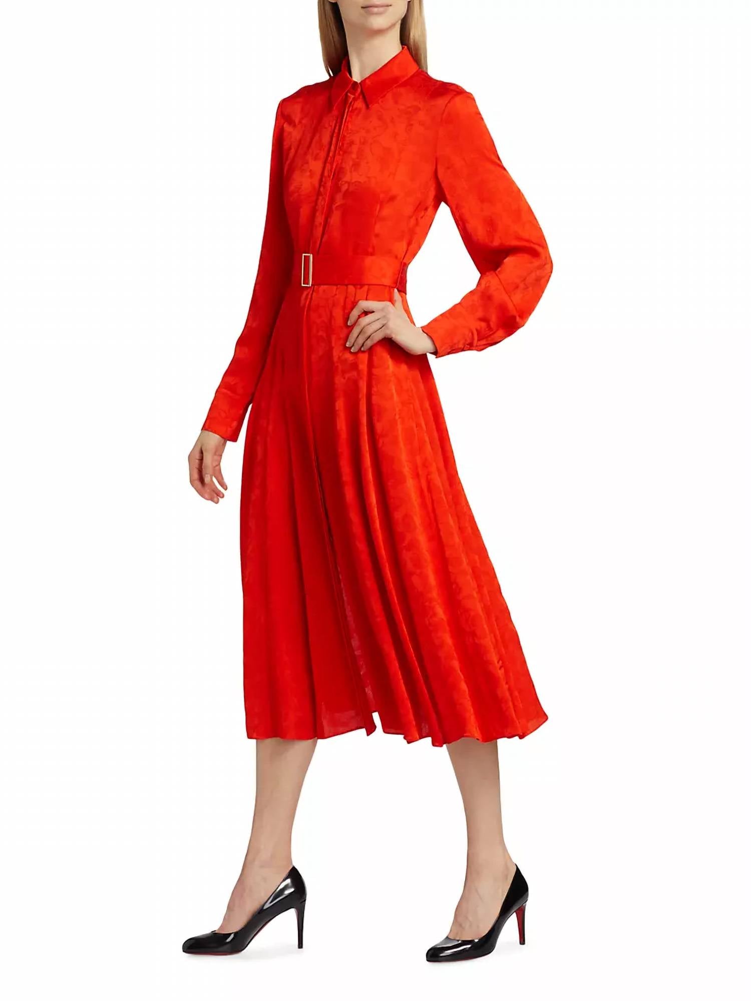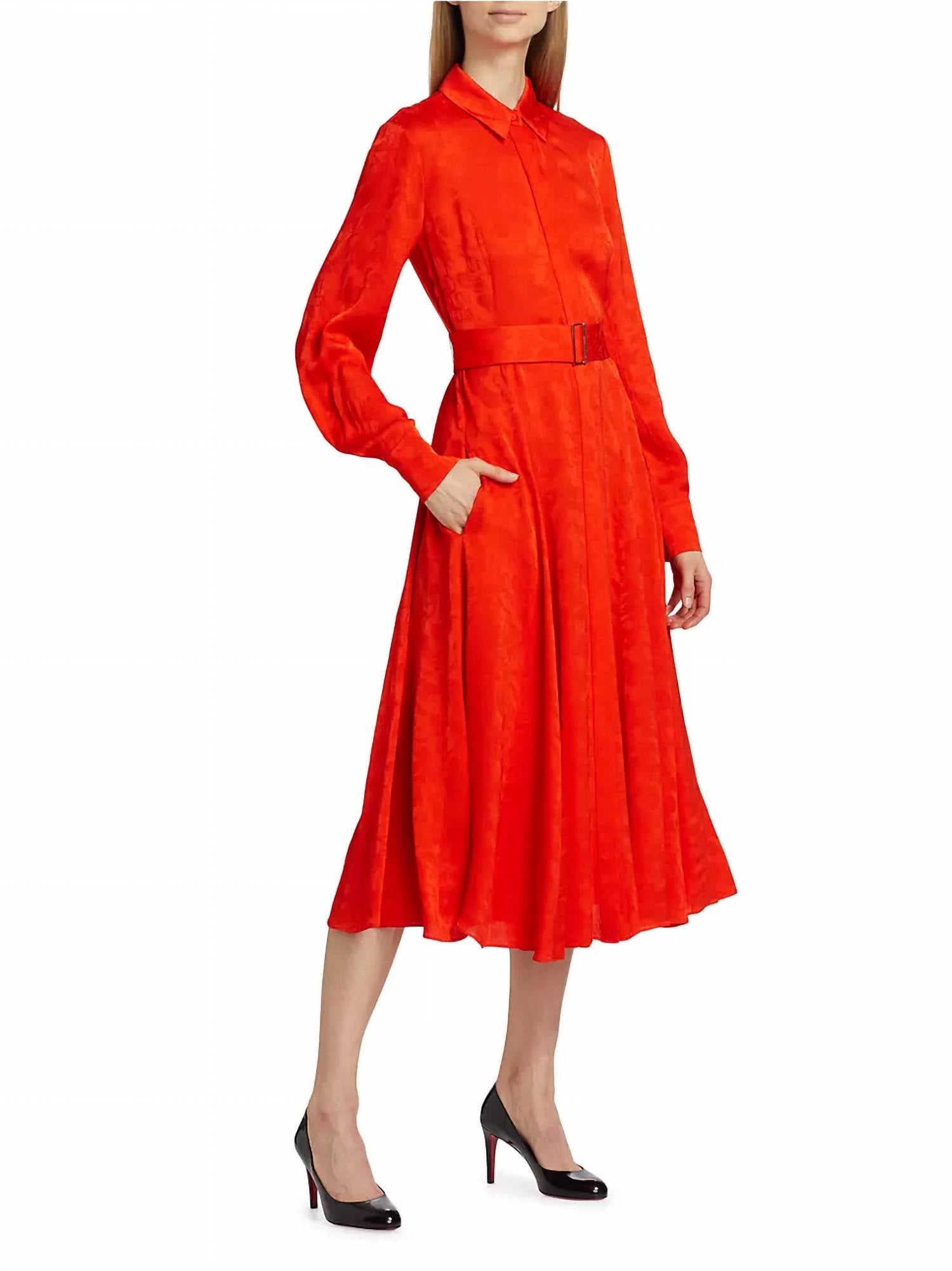 This intricately patterned A-line dress is crafted from 100% viscose, delivering a luxuriant feel and graceful movement. Featuring long sleeves, a classic point collar, and practical side on-seam pockets, it's designed for effortless style. Made in an imported jacquard, it comes with a removable belt and a concealed button-front placket for a sleek finish. Dry clean only.