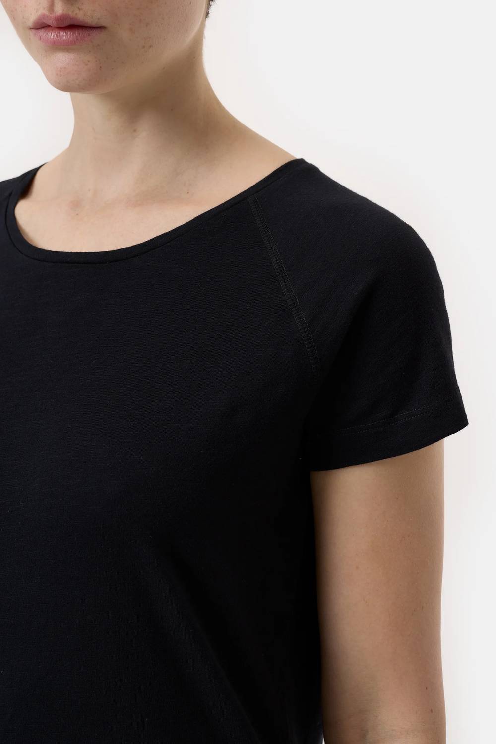 This classic, short sleeve tee will be your go-to staple this season and beyond. Discover the Raglan Cotton T-shirt by CLOSED, crafted for comfort and style in classic black. This women's tee features short raglan sleeves, a crewneck, and a regular fit with a total length of 26 inches. It is composed of 100% pure cotton with a soft slub jersey texture, offering a casual yet refined look. Designed and made in Portugal, this pull-on tee is machine washable for easy care.