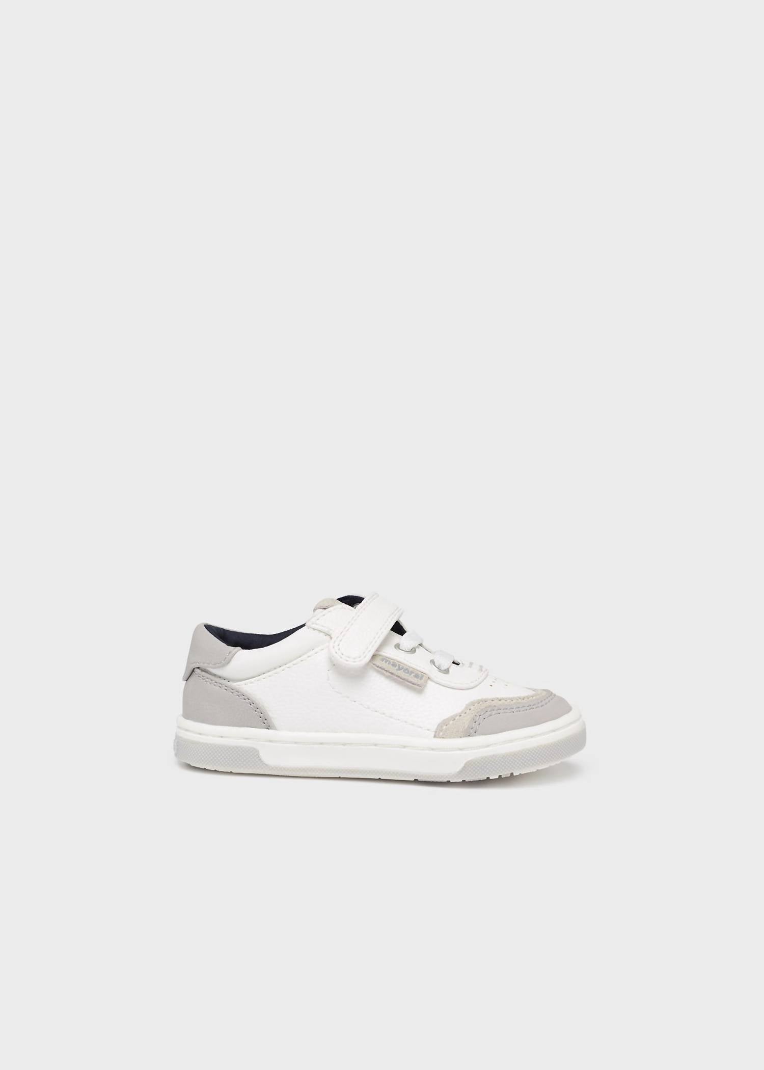 Introducing the Mayoral Kid's City Strap Tennis Shoe, a stylish choice for toddlers that's perfect for both daily wear and dressing up. This trendy sneaker in white and light grey features a mixed leather body, rounded toe, silver grommet detail, and an elastic lace accent complemented by an adjustable velcro closure. The court and instep are crafted from 50% bovineskin and 50% polyurethane, with a lining and insole made of 97% cotton and 3% elastane; its flexible sole is composed of 100% thermoplastic rubber. With a padded insole and flat heel design, this shoe ensures comfort and flexibility for active little feet.