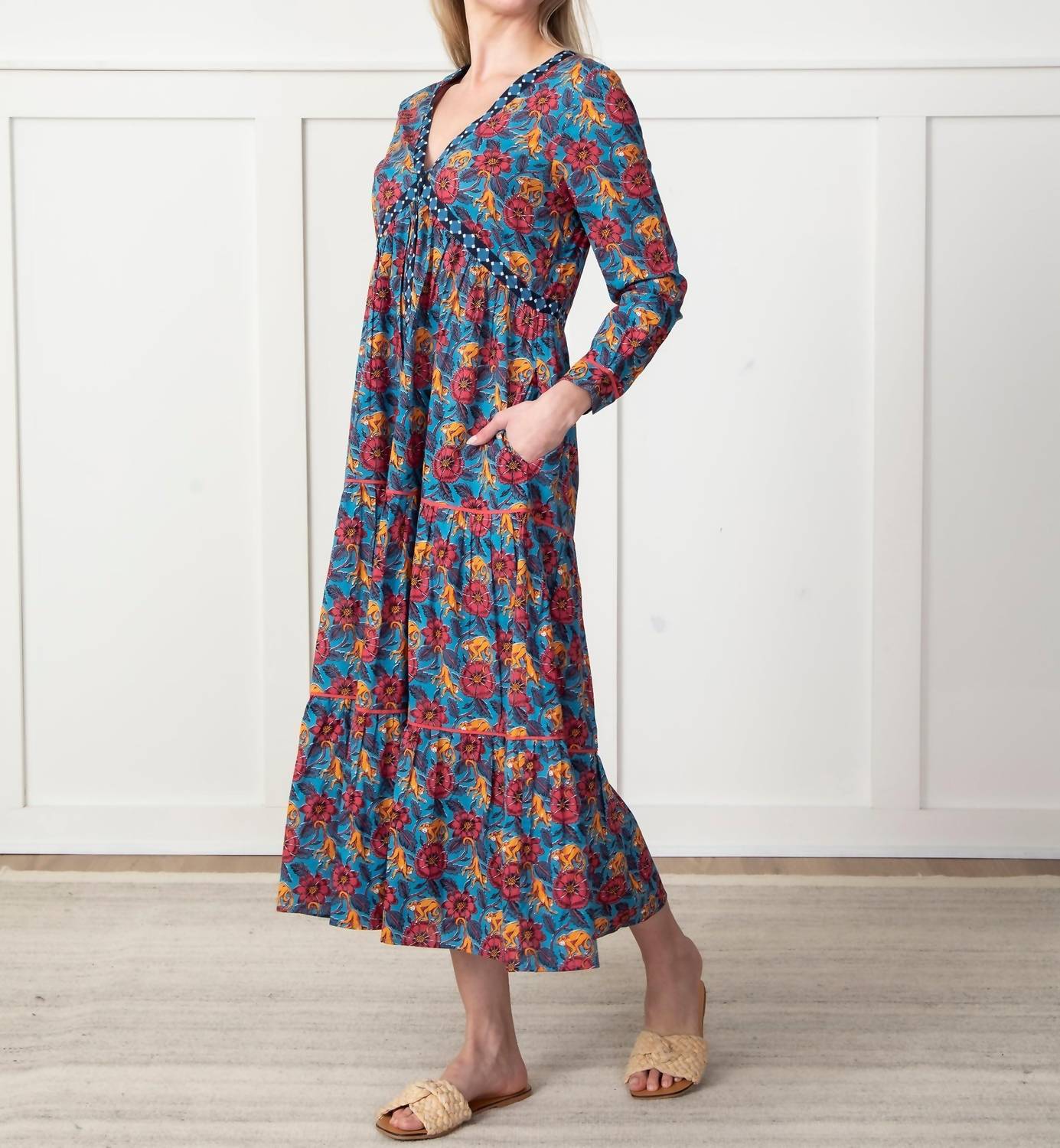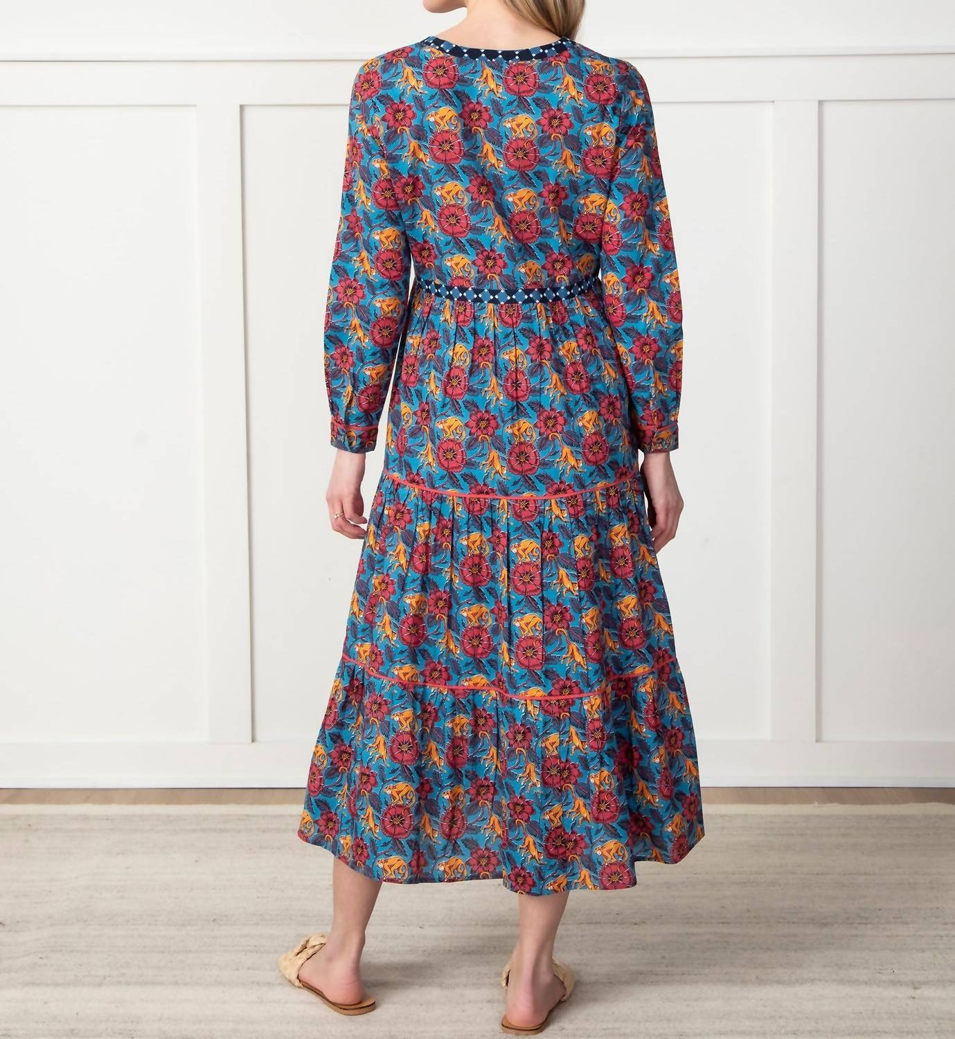 A midi dress so versatile, your options for wearing it are endless. Made from lightweight 100% organic cotton cambric, this dress features a charming floral pattern. With long sleeves and a fully button-down front, it boasts practical pockets. Lovingly designed in Philadelphia and hand screen-printed by artisans in India. Requires delicate laundering with like colors and can be tumble dried on low heat.