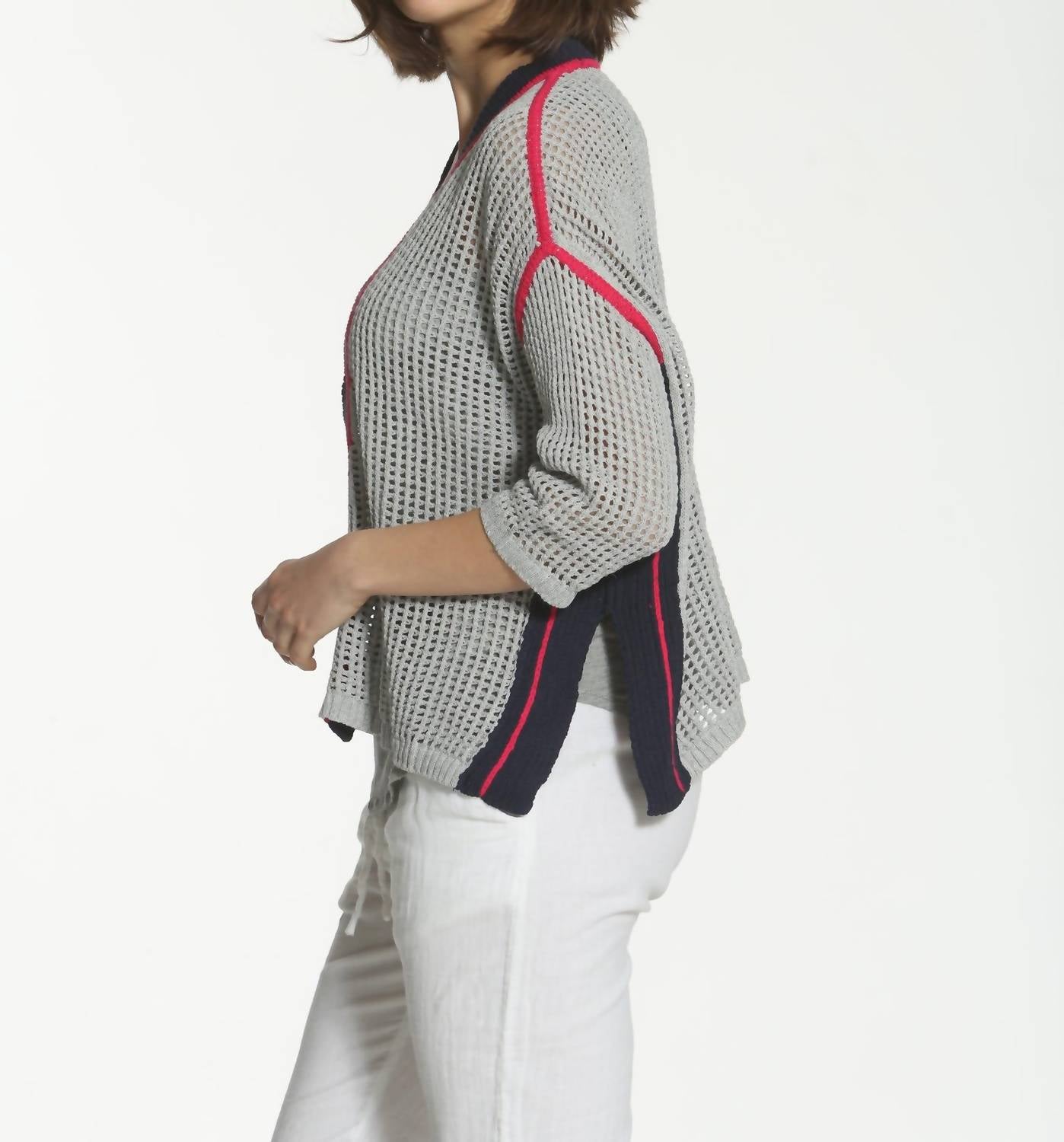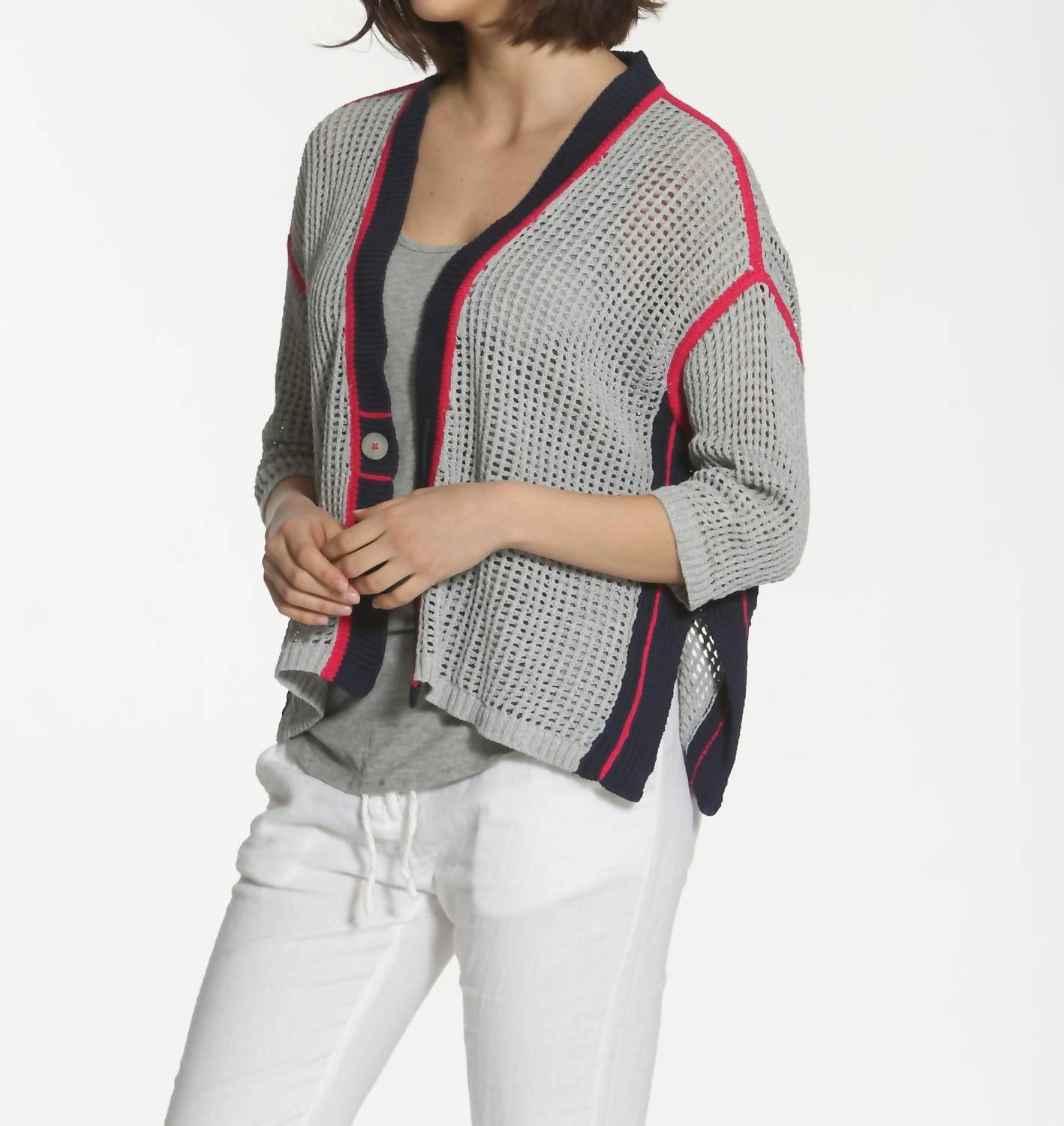 A classic fit that works just as good buttoned as it does left open. Elevate your wardrobe with the Refresh Cardigan by LABEL+thread, a chic addition in grey/navy designed for minimalist elegance. This short sleeve piece, made from 100% cotton, exudes comfort with its drop shoulder seams and relaxed fit. Featuring a mesh stitch and split side seams, it’s effortlessly stylish and provides graphic impact. Closure: Pull-on. Care: Hand wash or dry clean.