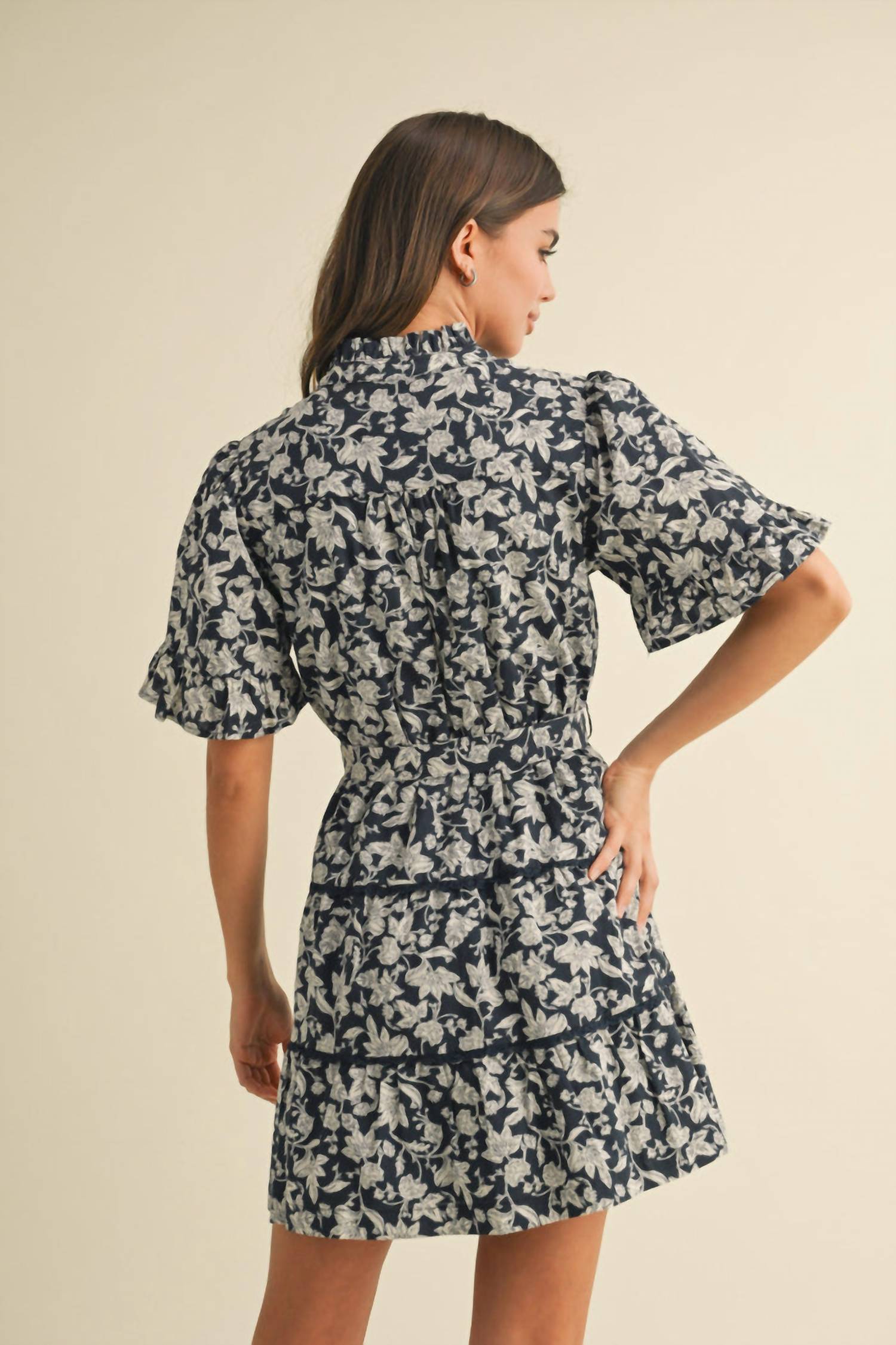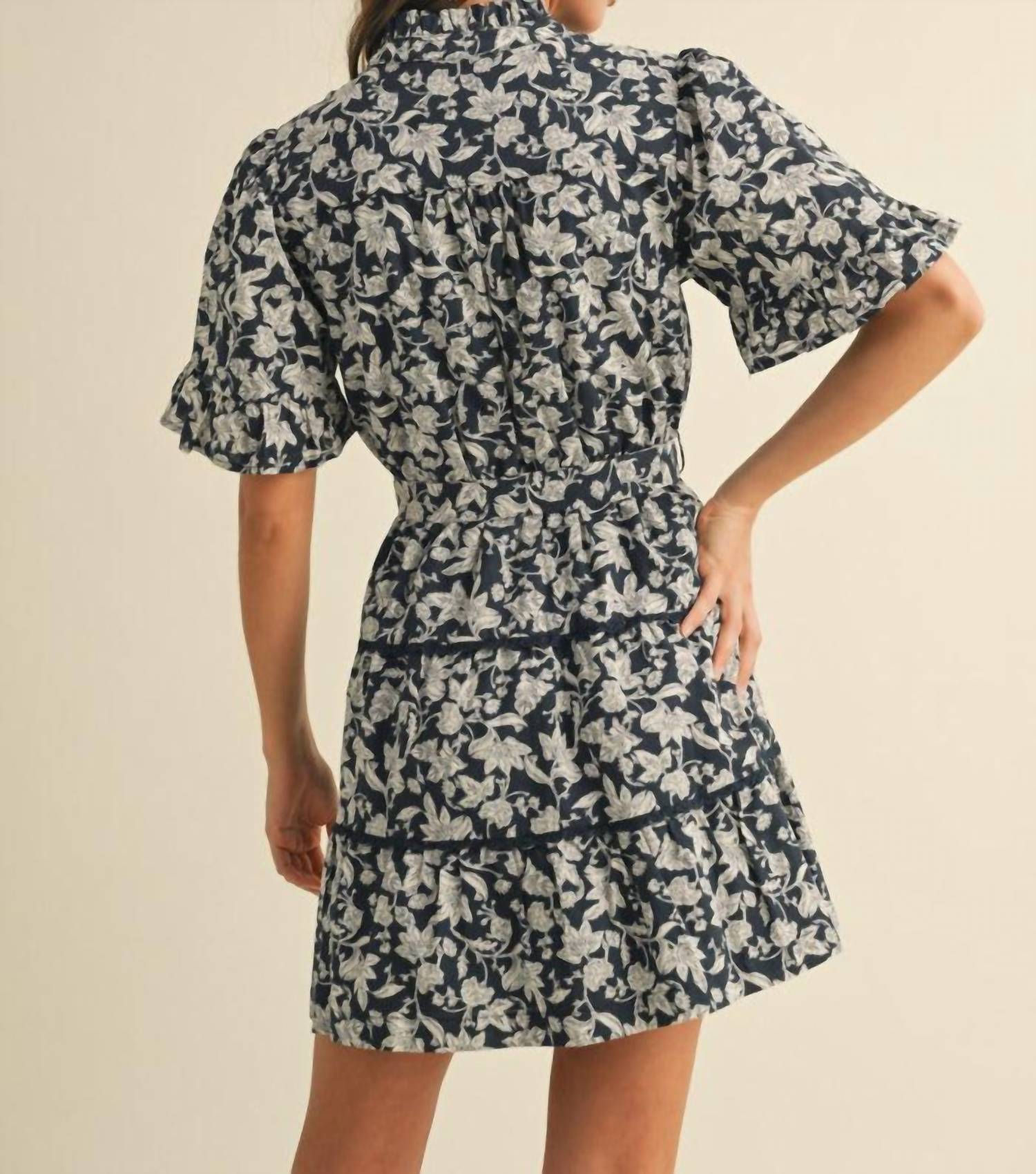 A short and breezy dress for those warmer days. Embrace a boho chic vibe with the &merci Ruffled Button Down Floral Mini Dress in a timeless navy hue. This A-line mini dress features charming elbow sleeves with ruffled cuffs and a delightful ruffled neckline. The design showcases an elastic waistband with a self-tying sash and tiered seams enhanced by crochet lace trim. Crafted for easy care, simply machine wash and lay flat to dry. Button closure.
