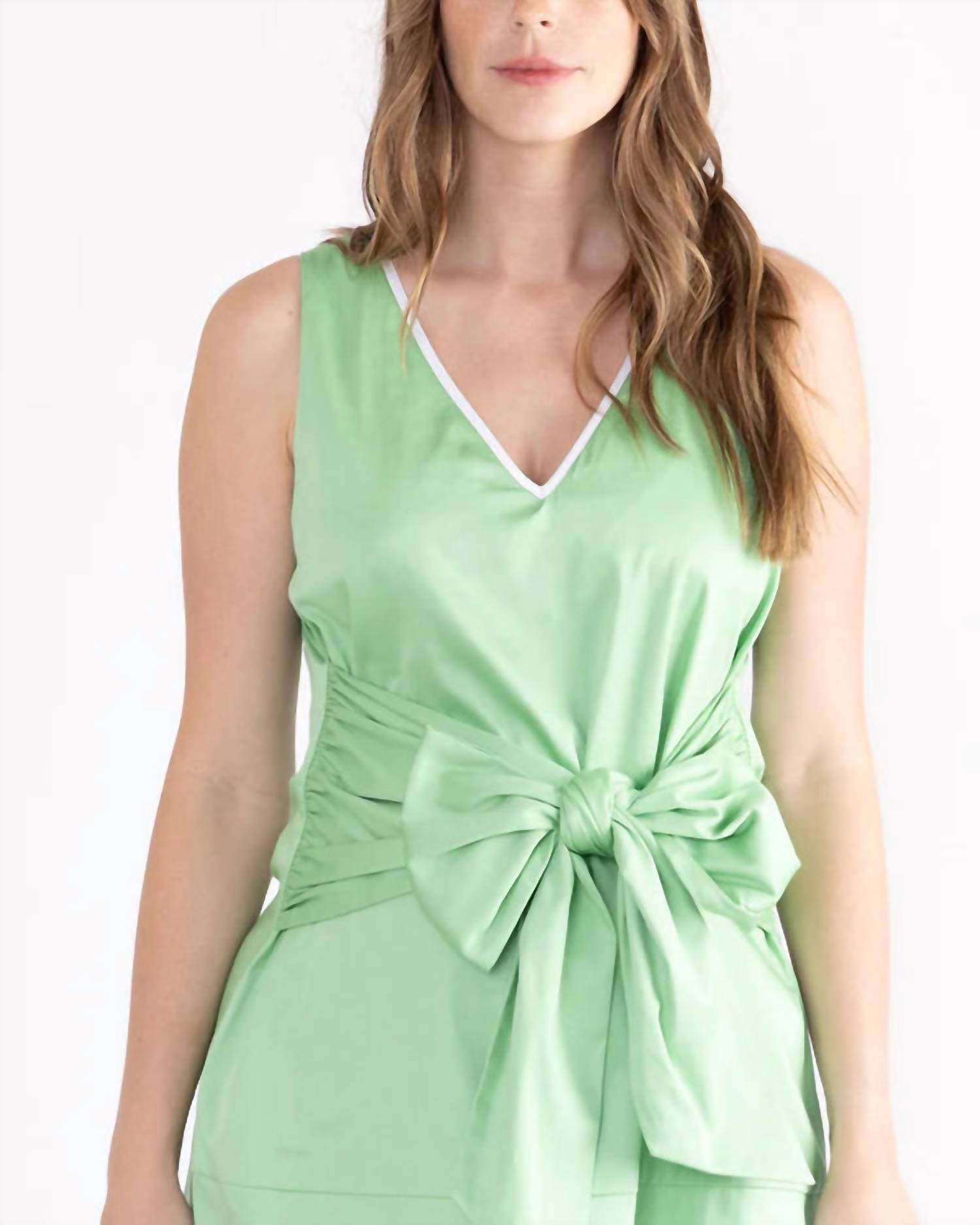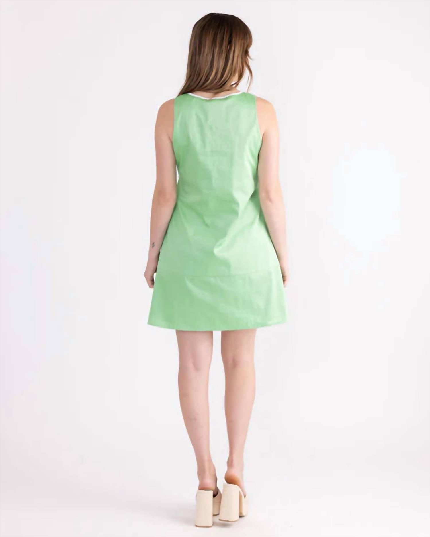 A short and breezy dress for those warmer days. The Alex Dress by S'edge in Paradise Green is a perfect minimalist addition to your vacation wardrobe. Crafted from a cotton blend, this sleeveless, mini shift dress is tailored to exude effortless summer style. Featuring a chic V-neck and a practical tie closure, its solid pattern offers a timeless appeal. Care for this dress is simple with machine wash and tumble dry instructions.