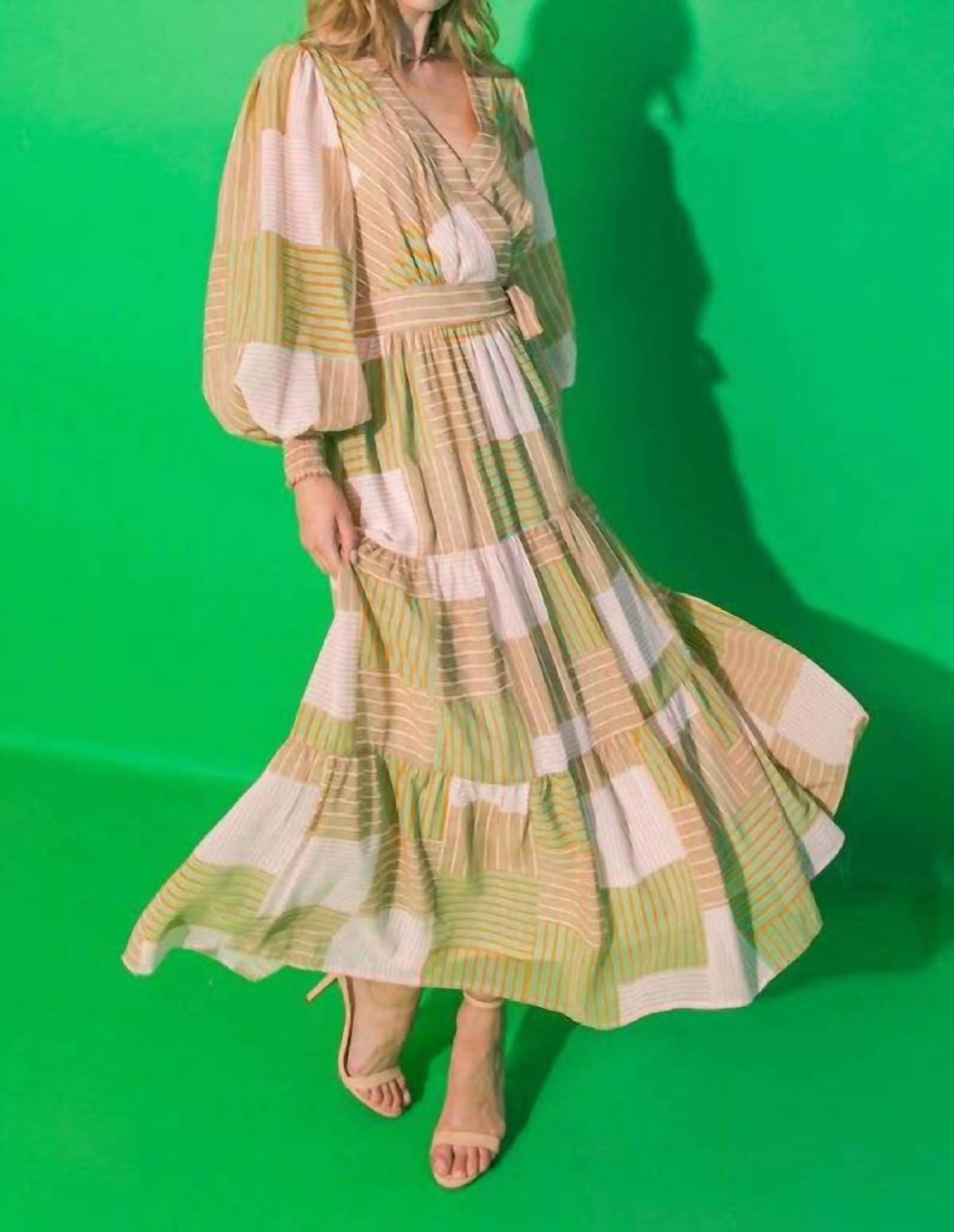 Who doesn't love a good maxi dress? This one you'll be reaching for season after season. Elevate your summer style with the Stripes Printed Woven Midi Dress by FLYING TOMATO, featuring long blouson sleeves and a flattering surplice neckline. This geometrically patterned wrap dress in taupe, green, and coral is designed with an attached side self sash for a cinched waist and a playful tiered skirt. Crafted from 100% polyester with a smocked back waistband, it offers both comfort and style. Length: Approximately 48", ideal for vacation or channeling 90s fashion trends. Model is 5'8" and wearing size small.