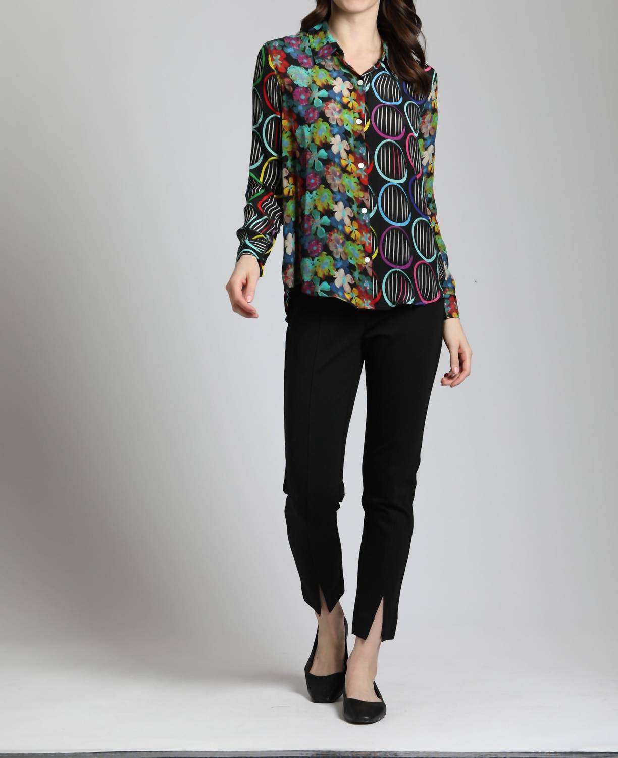 Apny - Mixed Pattern Printed Button-Up Blouse