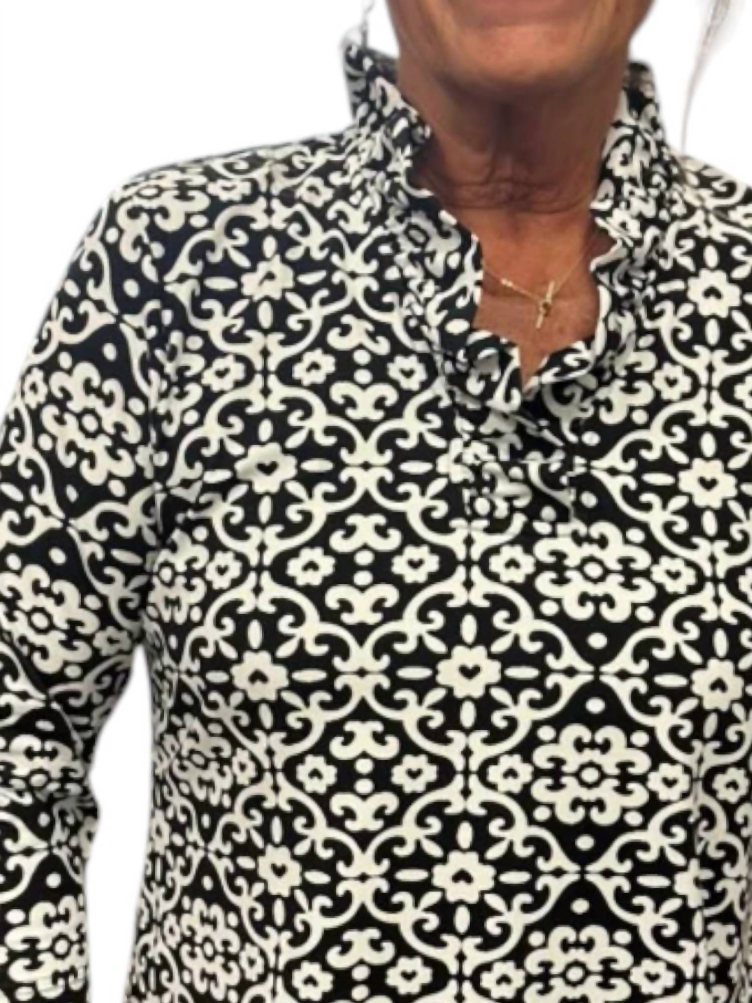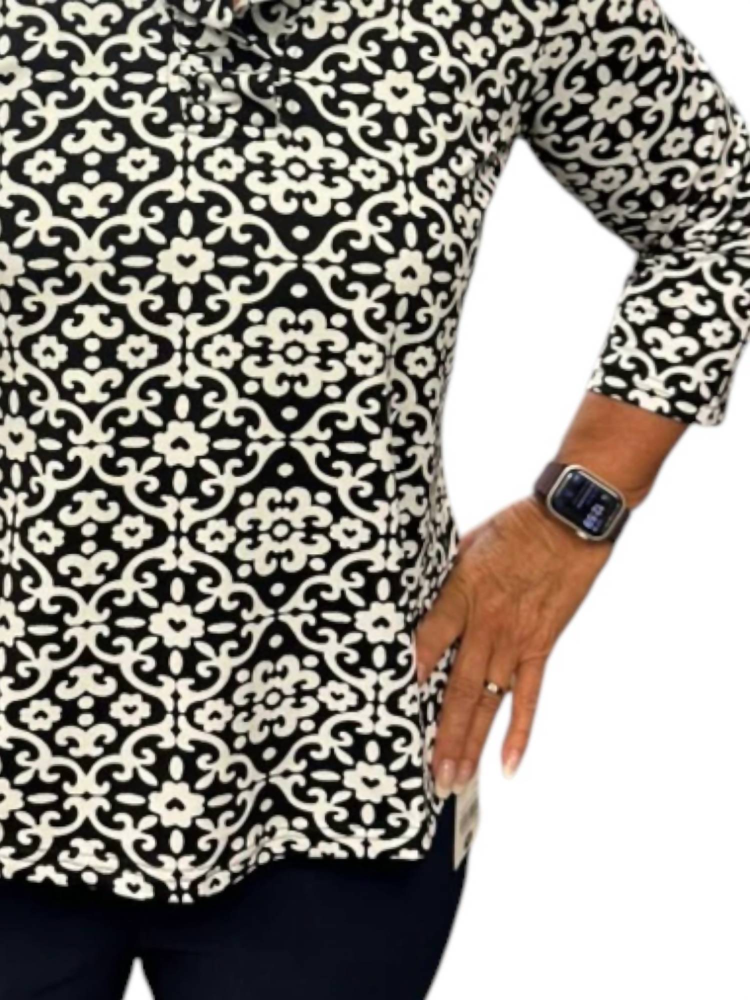 Pair this with your favorite jeans and slides for your next girls night out. The Ruffle Swirl 3/4 Sleeve Top by Lulu-B is a perfect blend of style and comfort, ideal for various occasions. With its three-quarter sleeves and a charming ruffle V-neckline, this top features a striking floral pattern in black and white with a touch of tan. Crafted from a 92% nylon and 8% spandex blend, it promises a flattering fit and easy wear. Closure: Pull on. Enjoy easy care with its cooling and UPF50+ features, making it a chic and practical addition to your spring wardrobe.