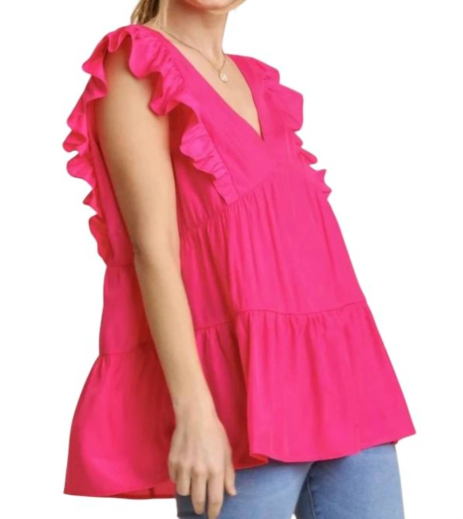 Introducing the Tiered Ruffle Babydoll Top by umgee, a perfect blend of playful style and comfort for women. This hot pink top is sleeveless with cap sleeves and features a tiered bodice and ruffle detailing, creating an a-line silhouette that complements any outfit. Composition of 65% Rayon and 35% Poly ensures a lightweight feel, with a pull-on closure for easy wear and care. This top is imported and best maintained by hand washing in cold water.
