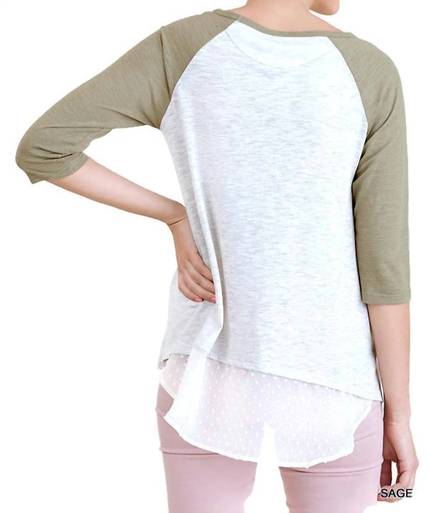 Discover the effortless style of the Umgee Raglan Sleeve Top in a serene sage hue. Designed with three-quarter raglan sleeves and a flattering A-line shape, this top is crafted from a poly cotton blend for ultimate comfort. It features a practical chest pocket, a boatneck neckline, and a unique high low hemline with a longer back. The easy pull-on closure makes it perfect for daily wear, while hand washing ensures its longevity.