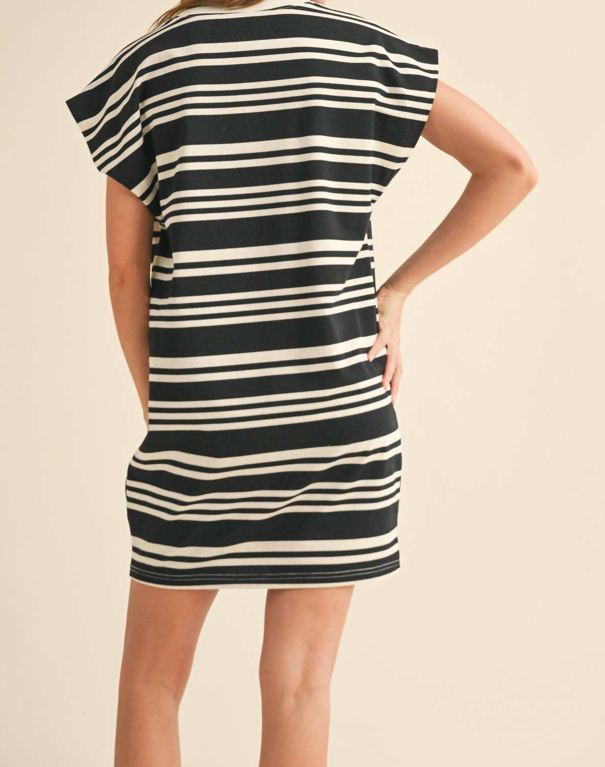 The perfect mini dress for those warmer months. Elevate your summer wardrobe with the Nyland Iana Striped T-Shirt Dress, a minimalist masterpiece perfect for holiday parties. This shift dress showcases stylish cap sleeves and a classic crewneck, offering both comfort and elegance. Crafted from 100% cotton, this mini dress features a chic black and white stripe pattern. Closure: Pull-on. Care: Machine wash. Ideal for women seeking effortless style with a minimalist edge.