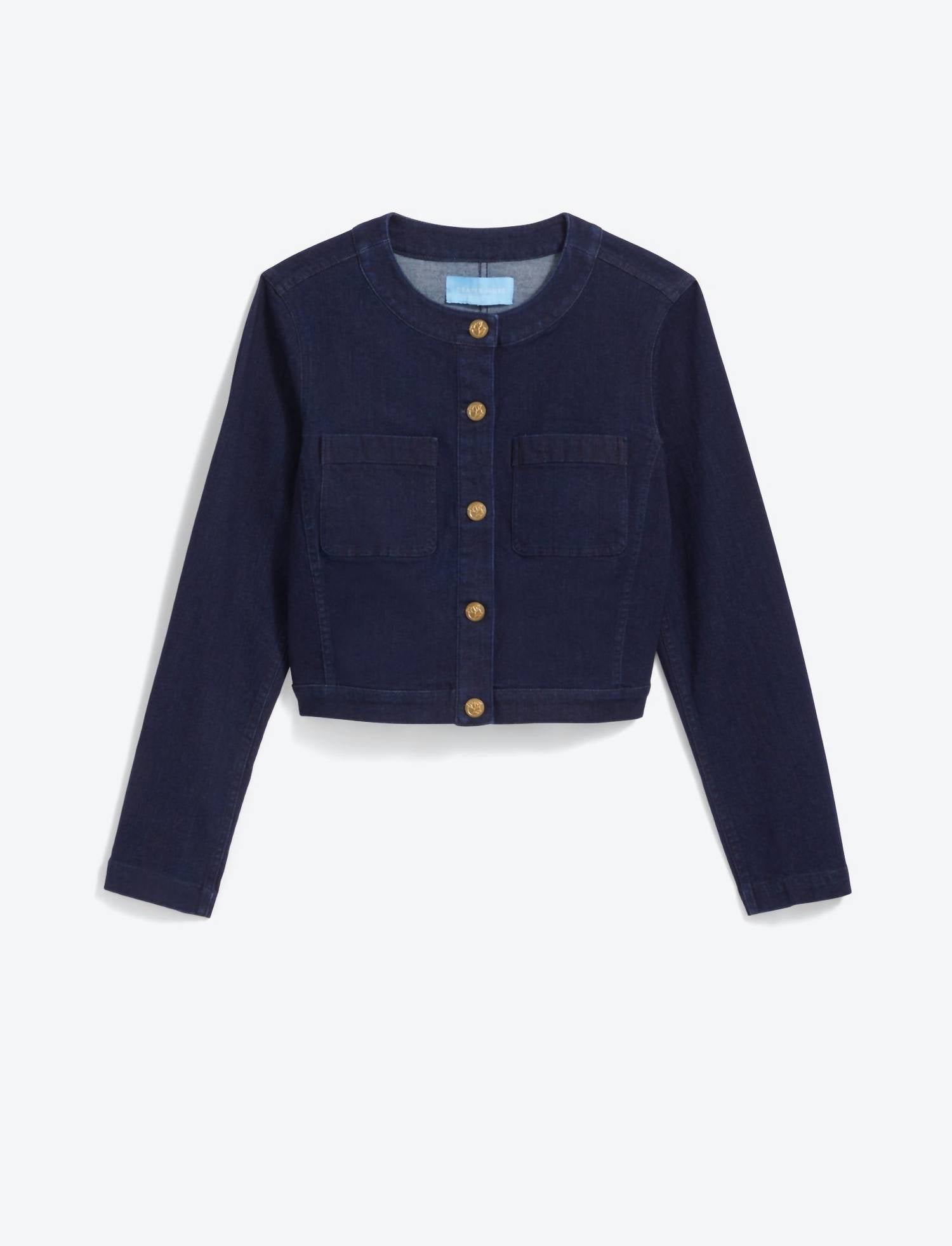 Classic piece features long sleeves. Crafted from a stretch denim blend composed of 71% cotton, 27% polyester, 2% spandex. Ensuring comfort and flexibility. Garment length is 17.25 inches with a distinctive pitched hem and center front button closure. Designed includes patch pockets. Easy to care for with machine wash instructions.