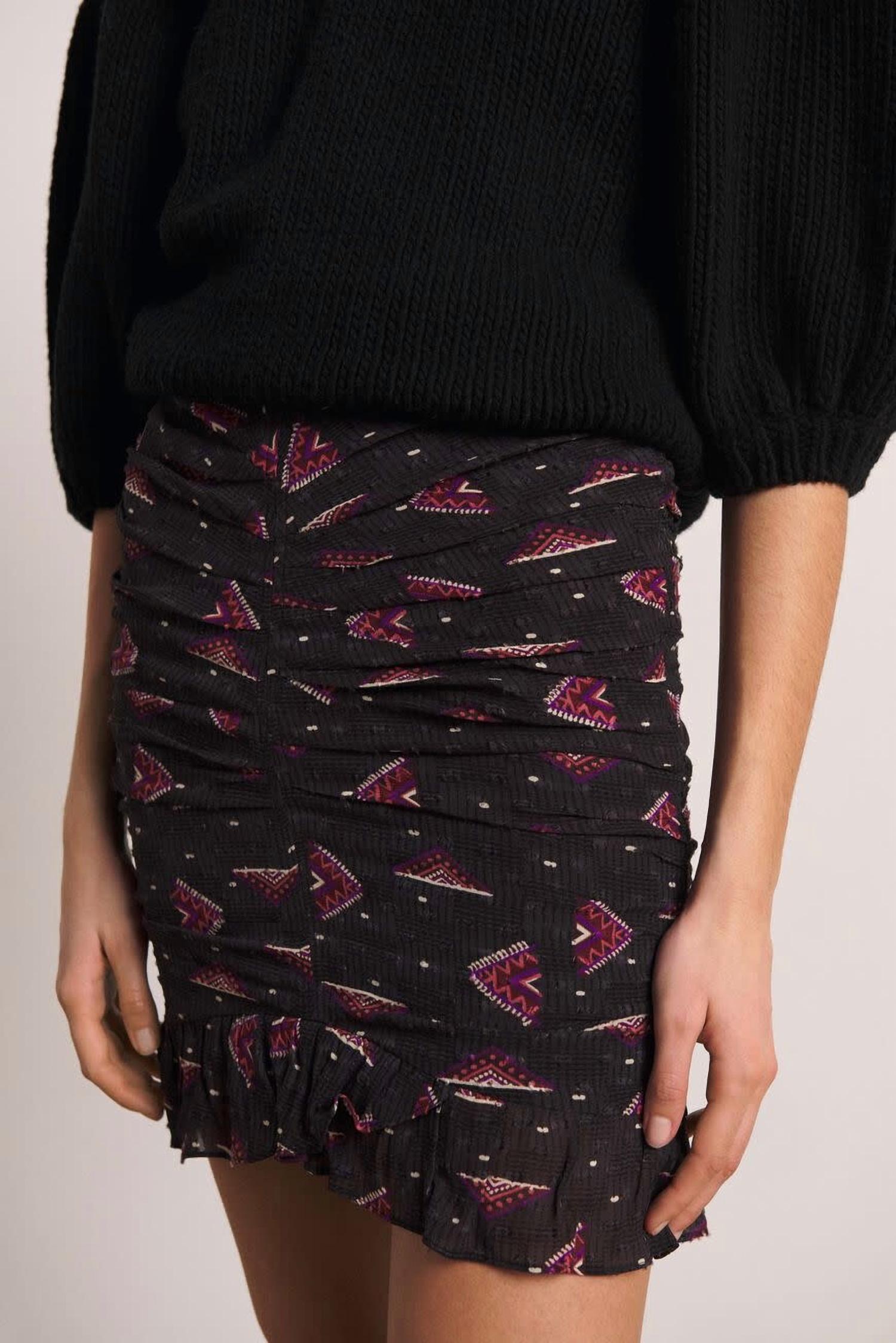 The CASSIE skirt by ba&sh is short, draping with flounces for a buoyant effect. This short skirt drapes horizontally at the front, finishing with a floaty flounce at the bottom. In smooth viscose with a detailed print, it blends retro and tribal inspirations with geometric shapes in warm colours. Wear this gorgeous skirt with ankle boots for a fashionable outfit. The viscose is made with product from sustainably managed forests. Printed short skirt. Front draping. 100% viscose