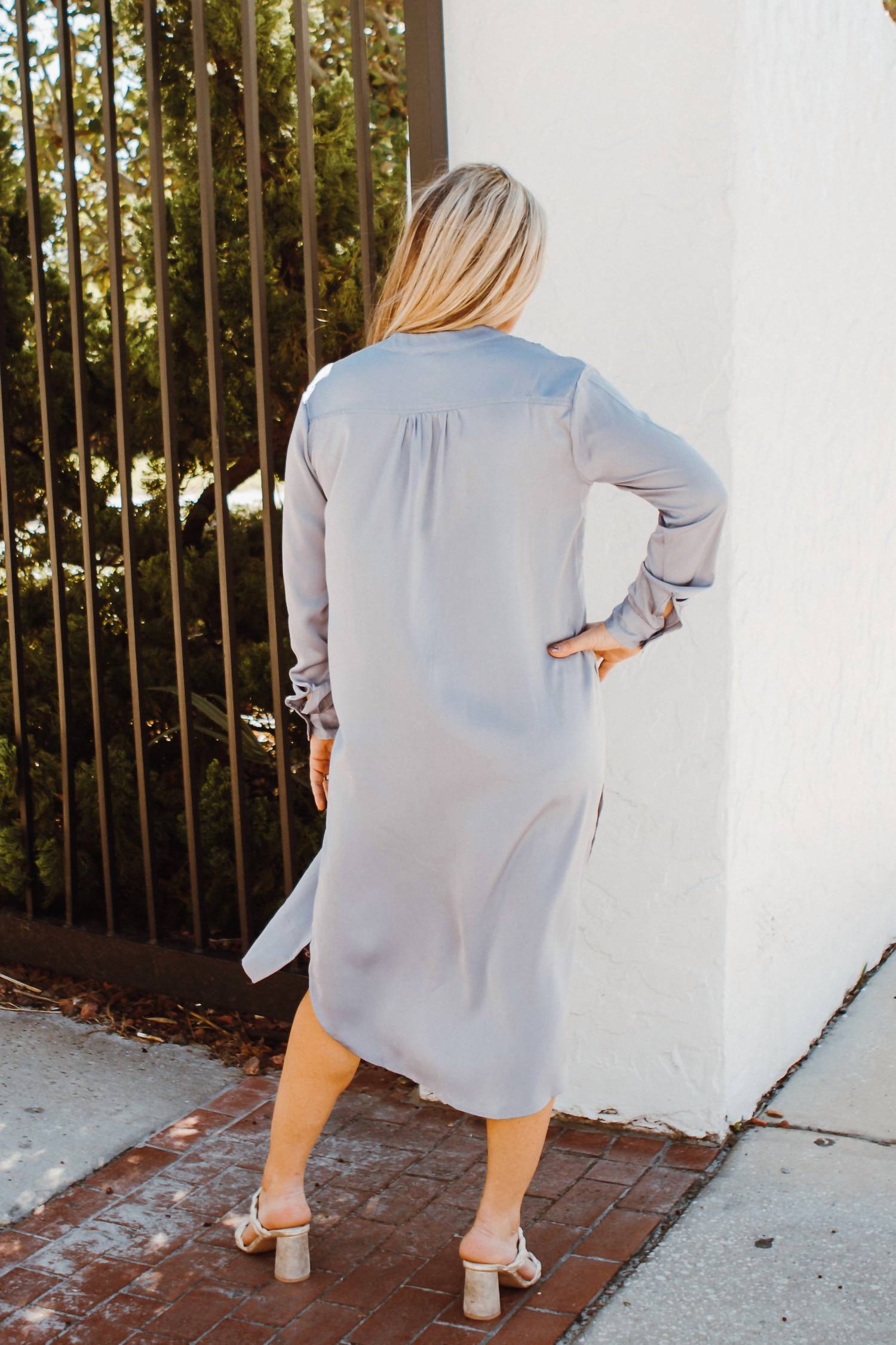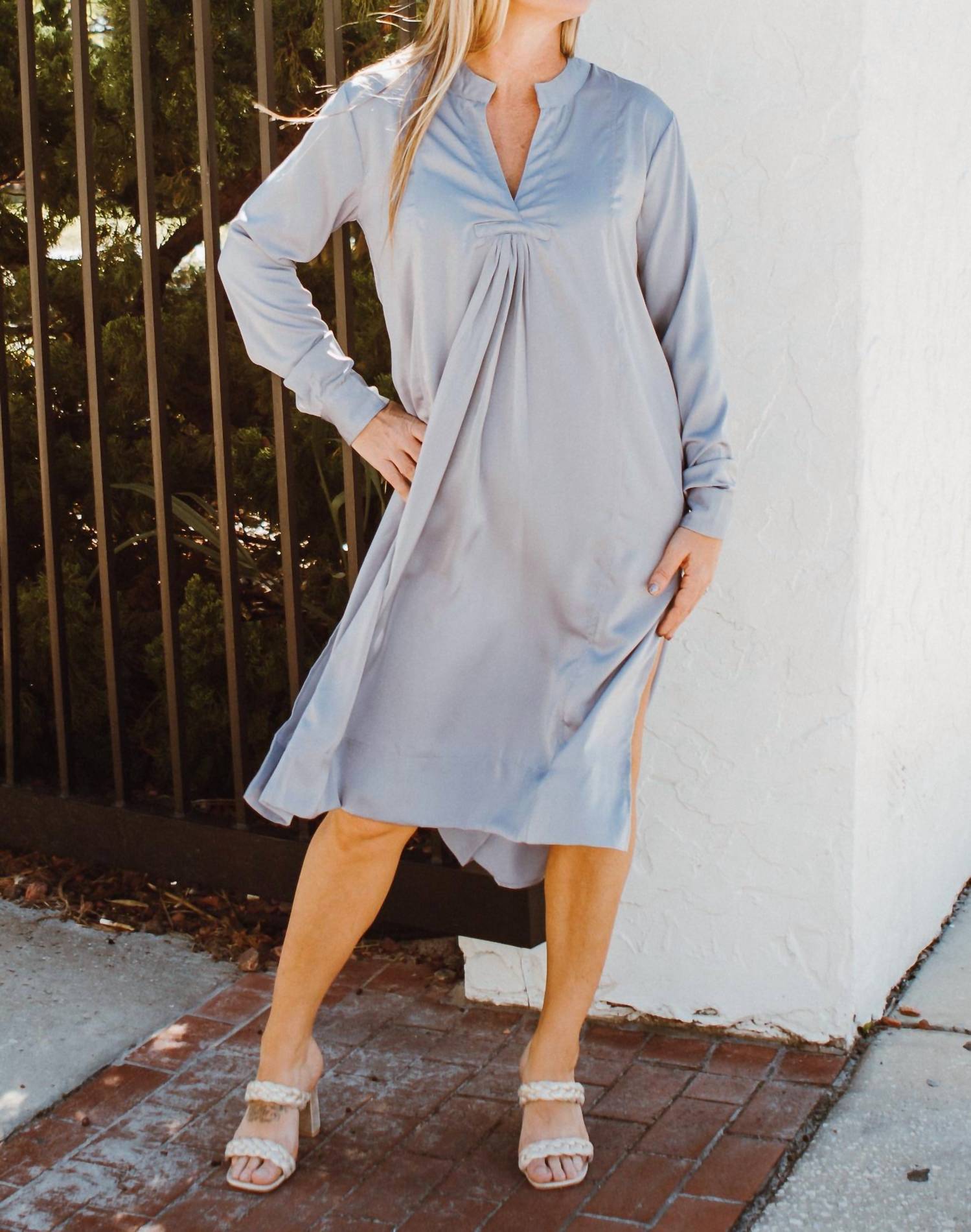 Style this maxi with your favorite statement necklace and sandals for the perfect look. Discover the Sylvie Tunic Dress by LUCCA in a striking iris hue, a staple piece that can effortlessly transition from day to night. Crafted in a luxurious satin with long sleeves and a refined V-neck, this dress exudes sophistication. Designed with a maxi length and a kaftan silhouette, it offers a relaxed and elegant fit. Closure: Pull on. The model is a size 4 wearing a medium, ensuring true-to-size comfort.