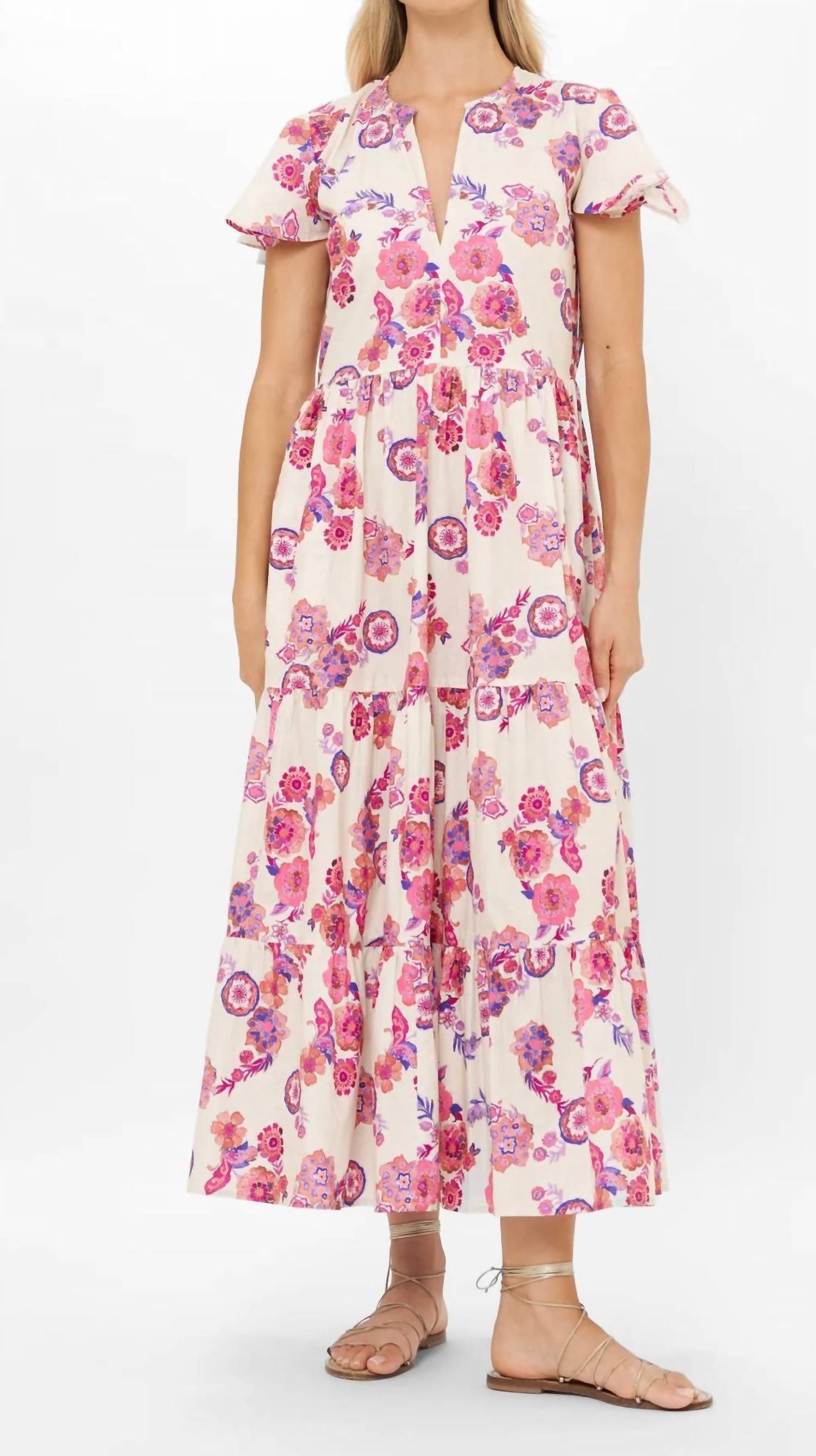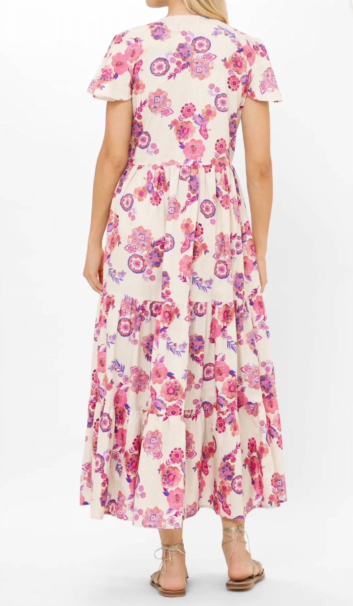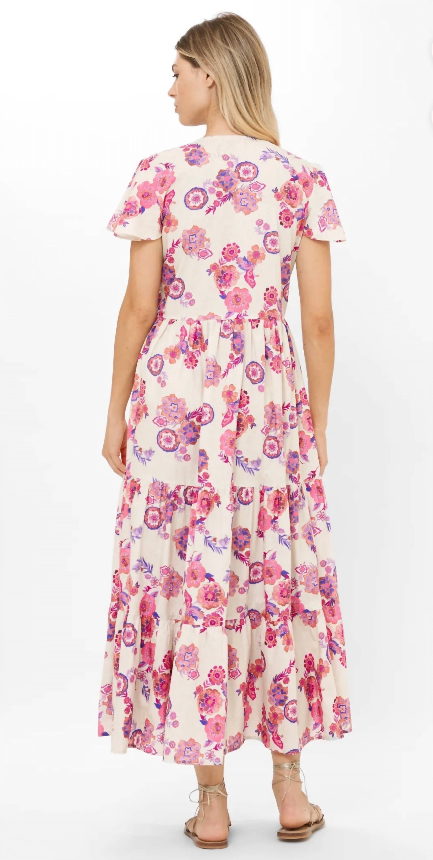 Who doesn't love a good maxi dress? This one you'll be reaching for season after season. The Painted Florals V-neck Maxi Dress by Oliphant in Pretoria Pink is a delightful choice for any spring dinner party. This A-line dress features short flutter sleeves and is made from 100% cotton poplin, ensuring a soft yet slightly structured silhouette. Its all-over floral pattern and tiered design add a maximalist touch, while the hook and eye closure at the neck provides a subtle detail. Designed in a relaxed fit with convenient side pockets, this pullover style dress is machine washable for easy care.