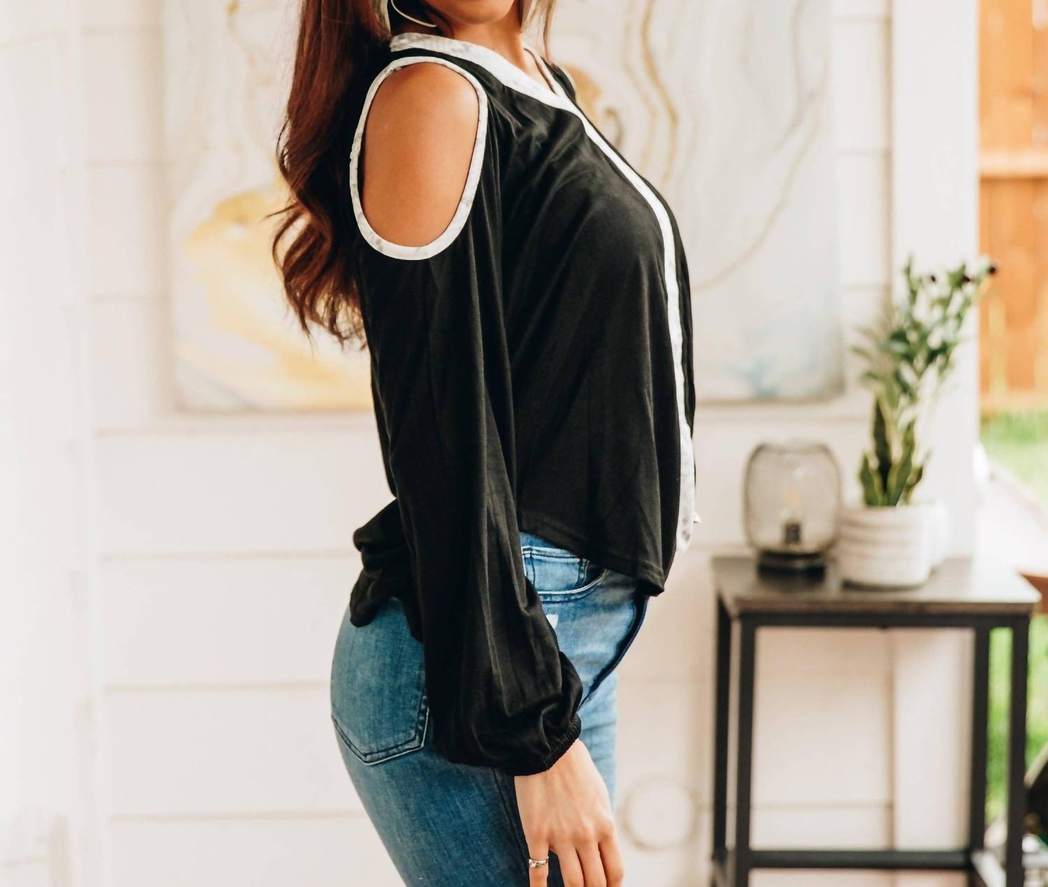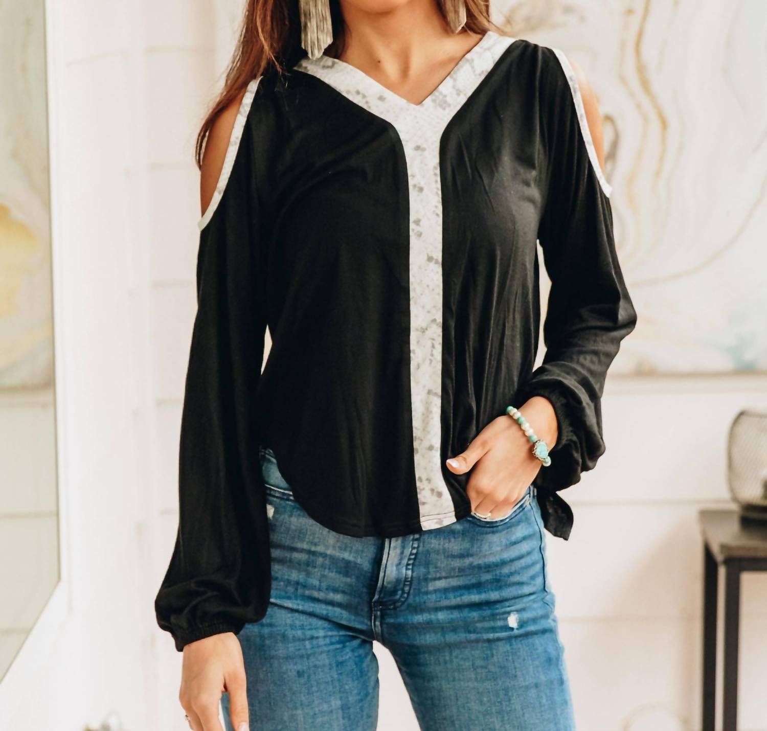Pair this with your favorite jeans and slides for your next girls night out. Elevate your style with the Simply Fierce Cold Shoulder Blouse by Southern Grace, a chic addition to your wardrobe. This lightweight black top features long sleeves with playful slits and a relaxed fit for added comfort. Crafted from a breathable blend of 65% cotton, 30% polyester, and 5% spandex, it offers the perfect mix of comfort and stretch. Designed with a V-neck and easy pull-on closure, this solid blouse pairs effortlessly with jeans or skirts for any casual occasion.