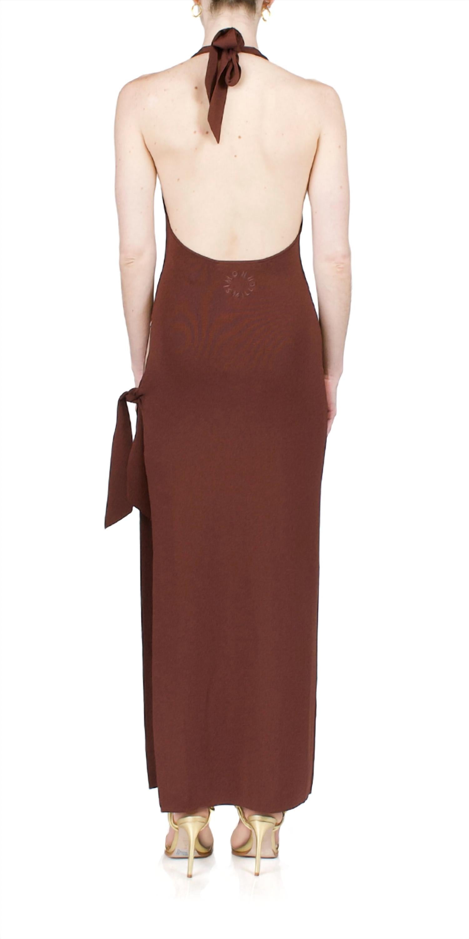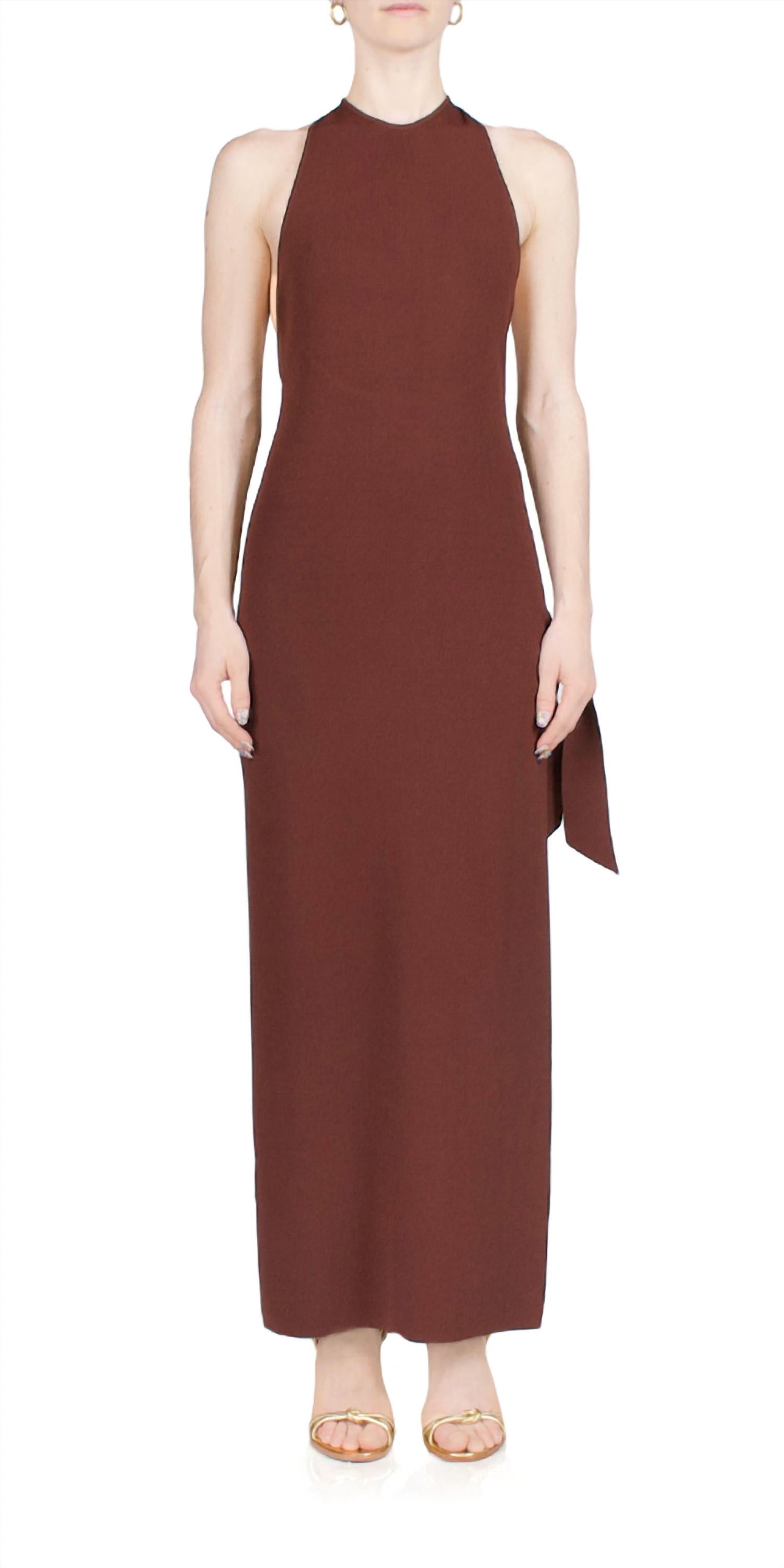 A maxi dress that is just as cute as it is comfortable. The Junjo Dress by Simon Miller presents sleeveless sophistication in a rich chocolate hue, crafted from a 65% viscose and 35% nylon blend. This maxi dress features a sleek halter neckline and a sheath silhouette, accentuated by an adjustable knot detail at the side. Its tie closure at the back of the neck enhances its elegant simplicity. Ideal for women seeking a timeless addition to their wardrobe. Model is 5ft 5in, wearing a size S.