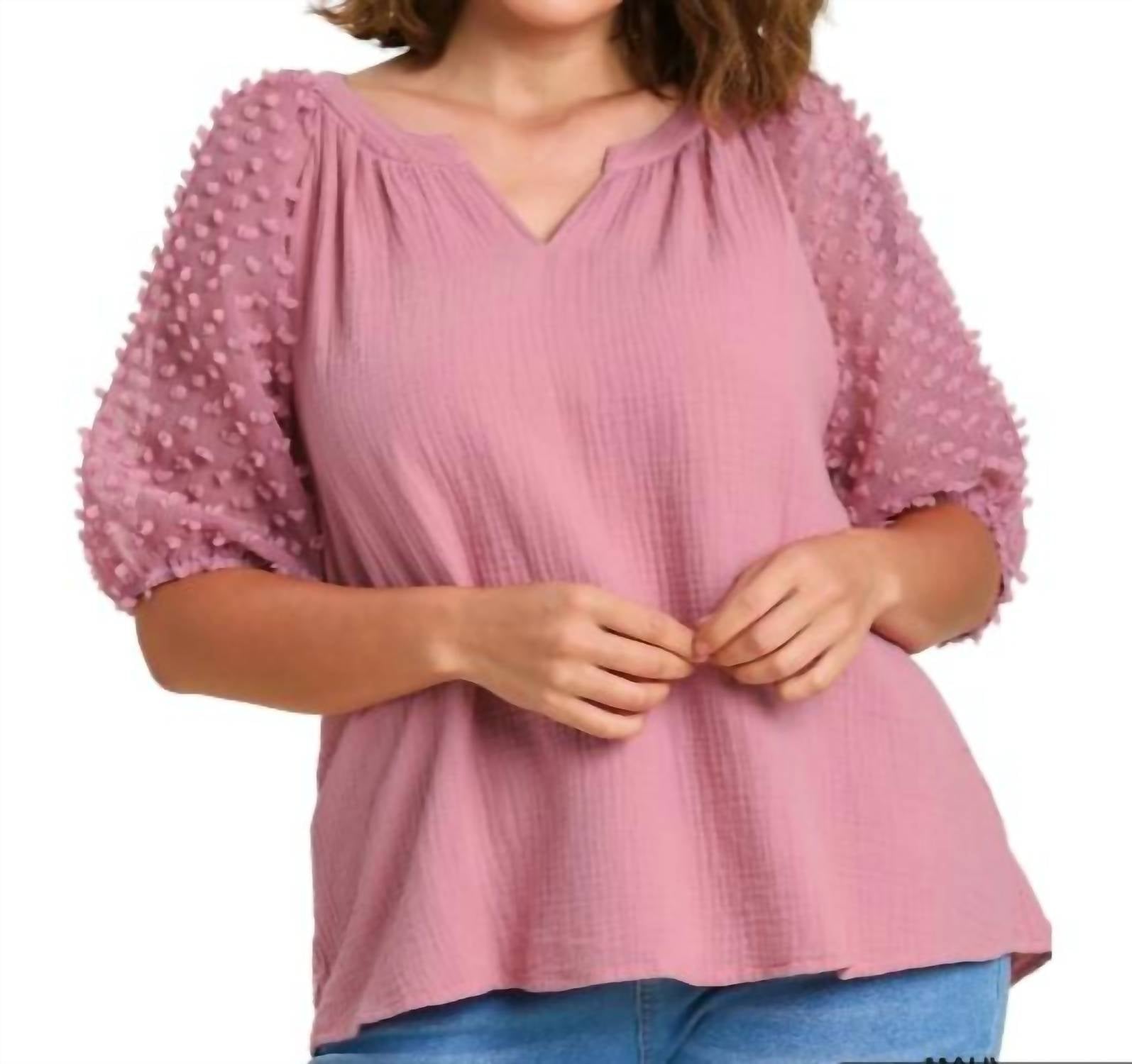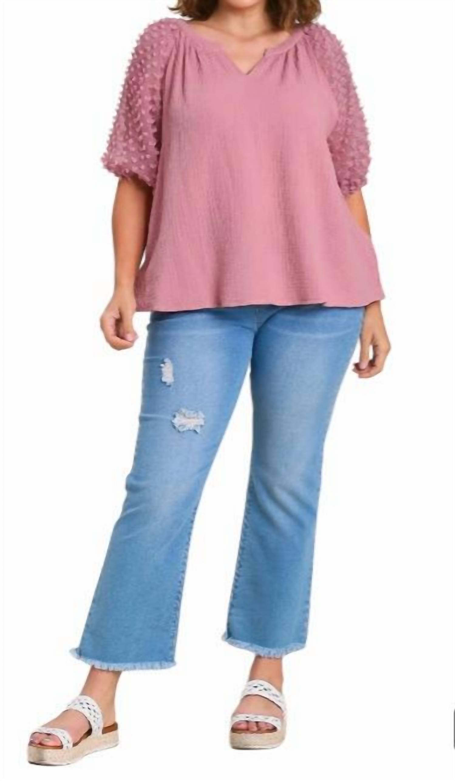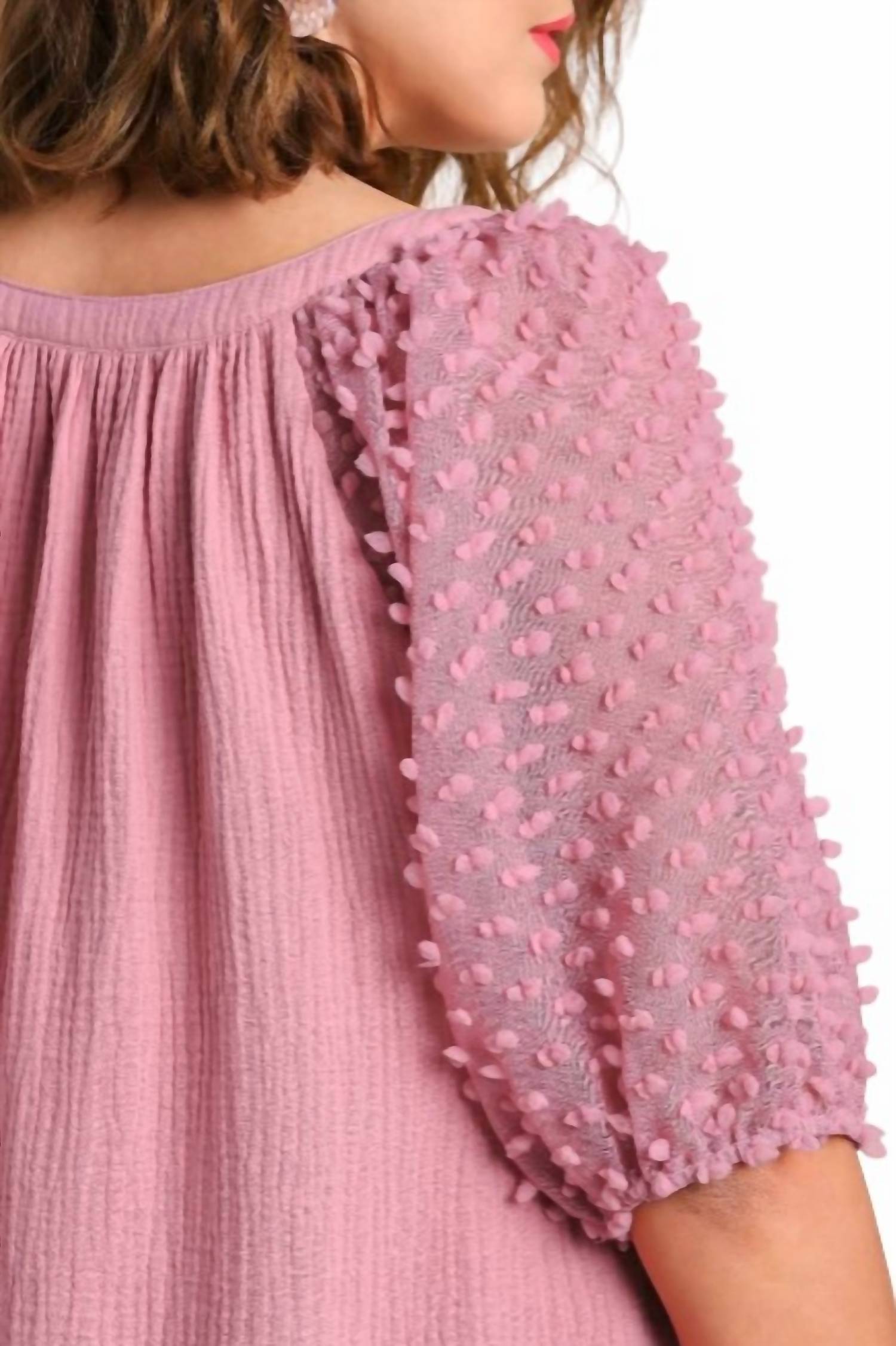 Split Neckline. Pleating Across Back. 3D Floral Applique On Sleeves. No Lining. Lightweight. True To Size. Loose Fit. 100% Cotton.