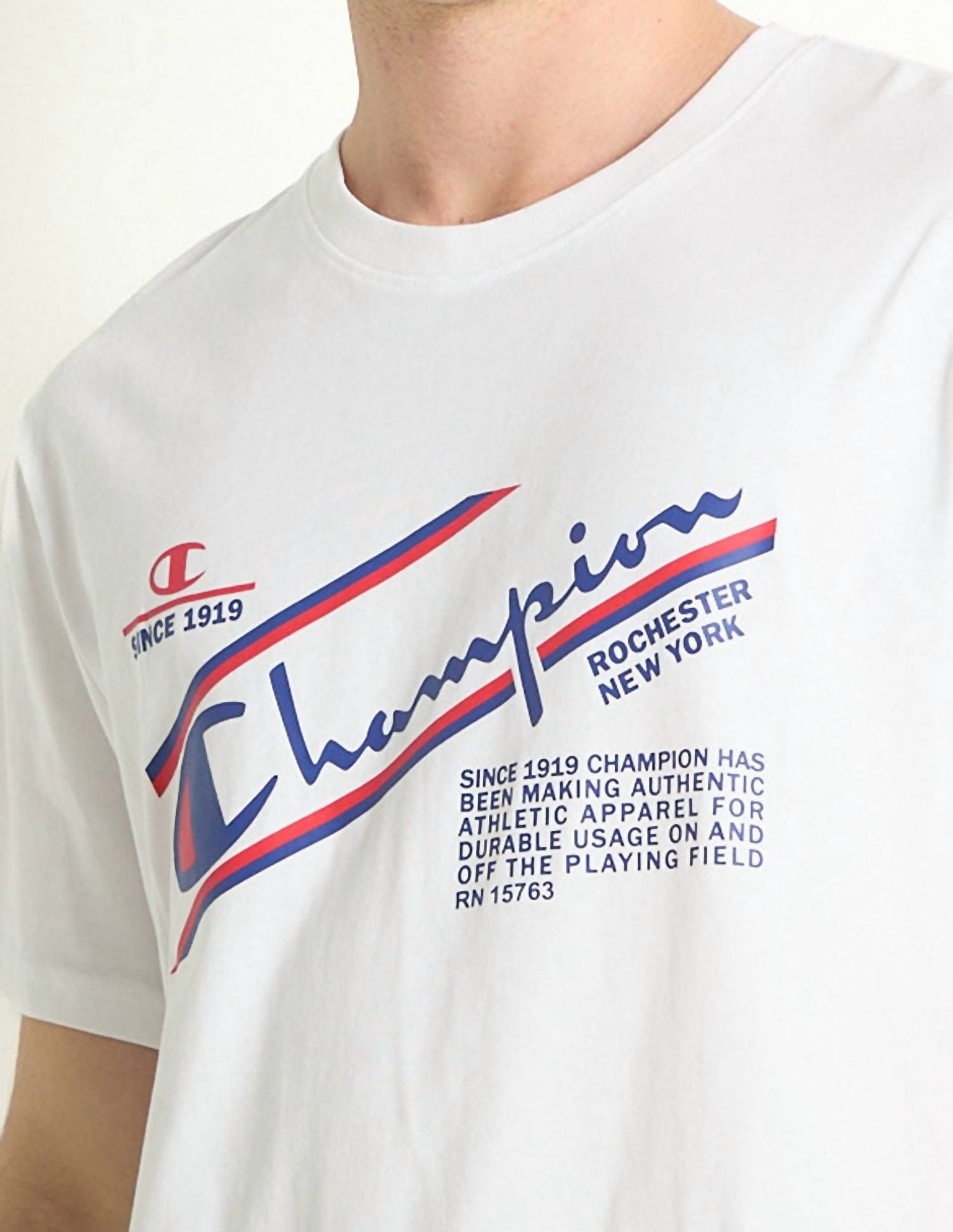 Elevate your sporty wardrobe with the Champion Player Rochester Short Sleeve Top in crisp white. This men's T-shirt offers a modern silhouette with its standard fit and dropped shoulders. Crafted from midweight 100% cotton, it features iconic graphics and the recognizable C logo patch on the left sleeve. Closure: Pull on. Perfect for game day, it integrates easily into your everyday rotation. Care: Machine wash cold with like colors.