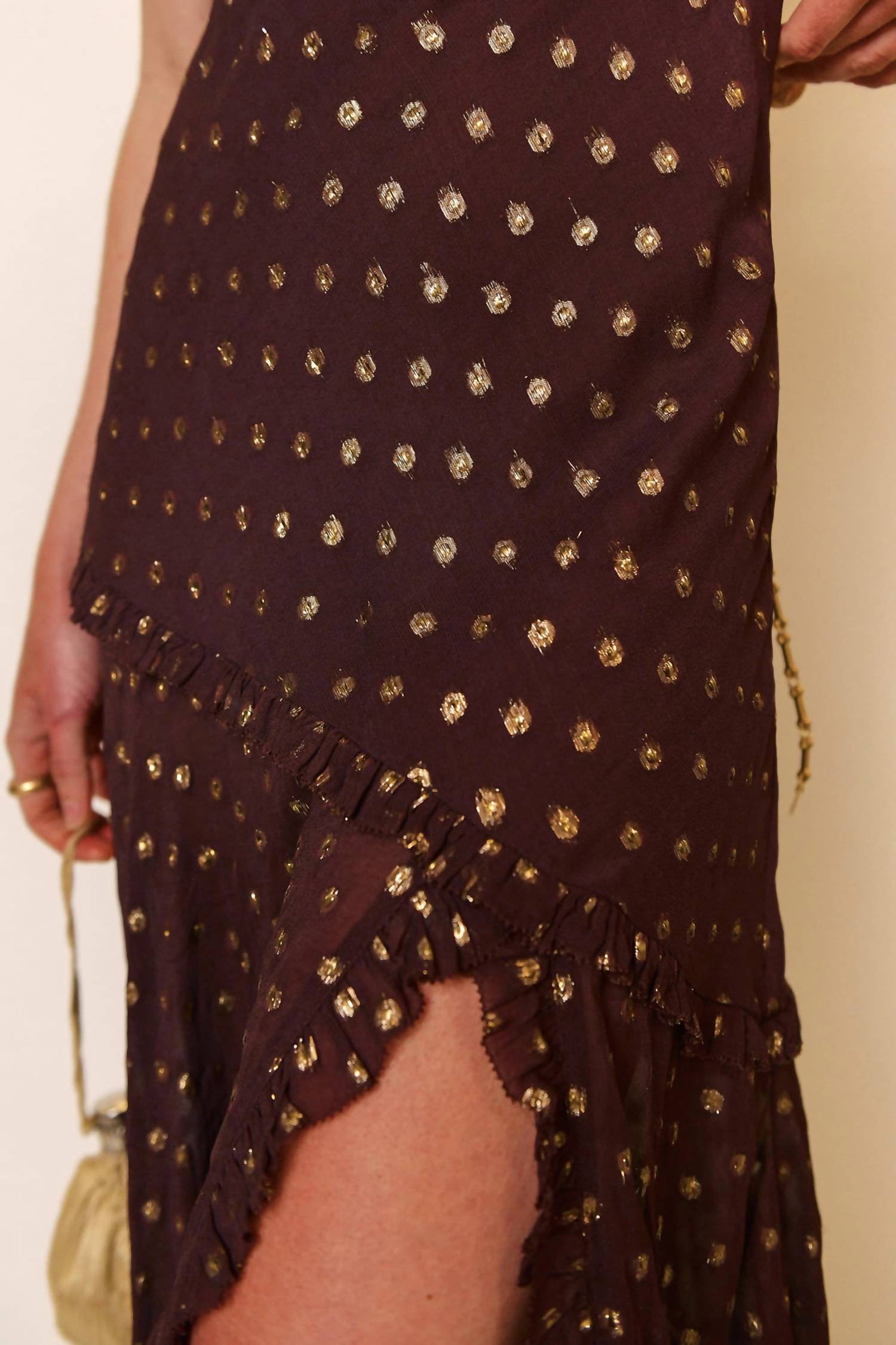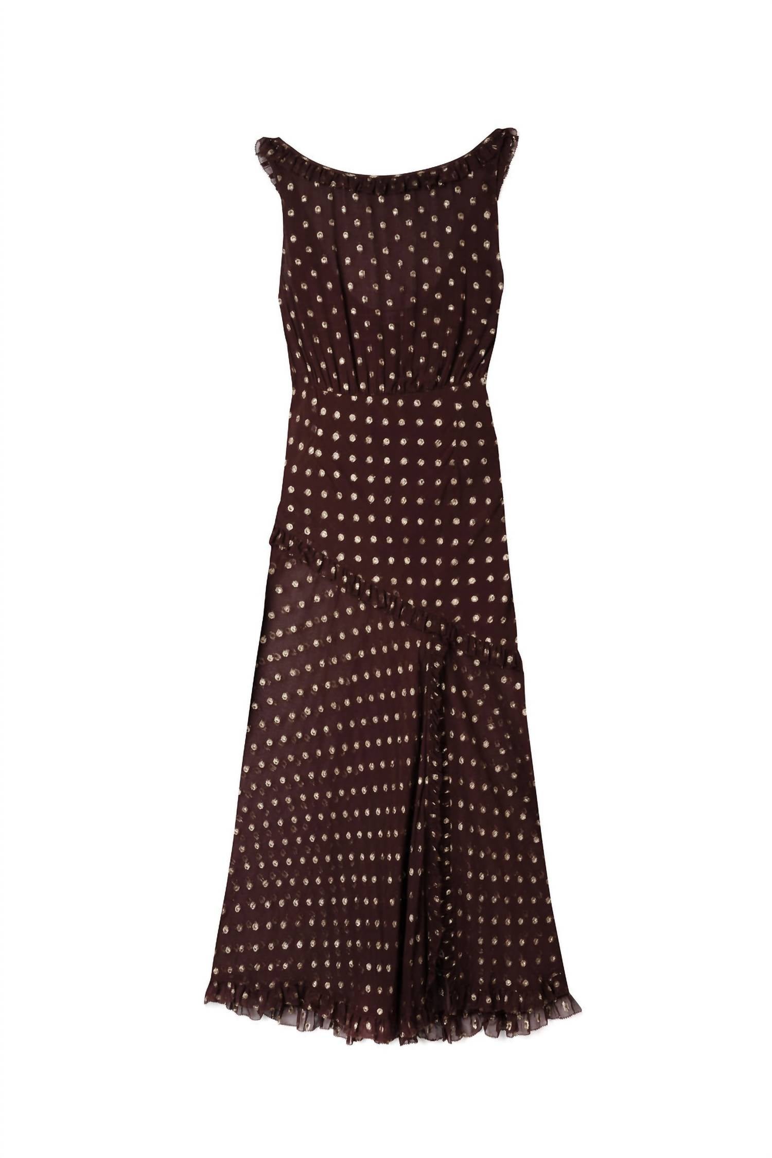 Presenting the RIXO Barrette Midi Dress in a striking Chocolate Lurex Spot, perfect for elevating your evening wardrobe. This sleeveless dress is crafted from 100% viscose crepe adorned with a vintage-style gold spot pattern, offering a touch of glamour with its boatneck and low scooped back. The fit and flare silhouette features a flattering natural waistline, with an asymmetric seam mid-skirt and a daring left-leg split, enhancing its sophisticated design. Closure: Concealed zip closure on the left side. Care: Hand wash.