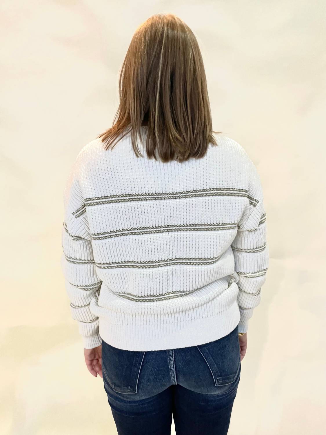 The ultimate go-to sweater, expertly crafted to provide the perfect combination of warmth and style. Its classic design and soft fabric make it a must-have addition to your wardrobe. Elevate your holiday wardrobe with the Seraphina Metallic Stripe Sweater by Thread & Supply. In a stunning snow color, this long sleeve sweater is crafted from a comfortable cotton blend, featuring 93% cotton and 7% polyester. Designed with a chic crewneck and metallic gold stripes, it's perfect for pairing with jeans or a skirt for a versatile look. Originating from a high-quality background, this piece offers a pull-on closure and care instructions recommend hand washing and laying flat to dry. The model is 5'6" and wearing a medium, fitting true to size.