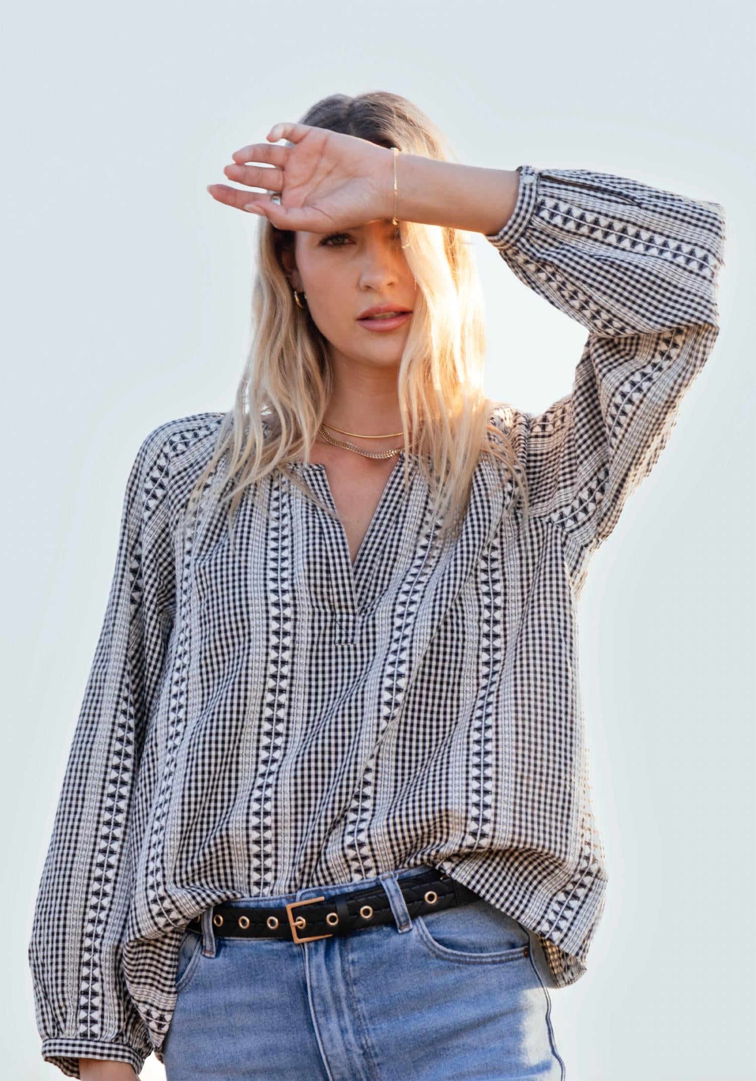 A versatile blouse that works from desk to dinner! Discover the Bennet Blouse by Dylan, a boho chic addition to your summer wardrobe. Featuring elegant long sleeves and a v-neck design, this patterned blouse is crafted from 100% cotton for ultimate comfort and breathability. With a versatile pull-on closure, it's perfect for vacations or everyday style. Embrace effortless sophistication with this timeless black piece.