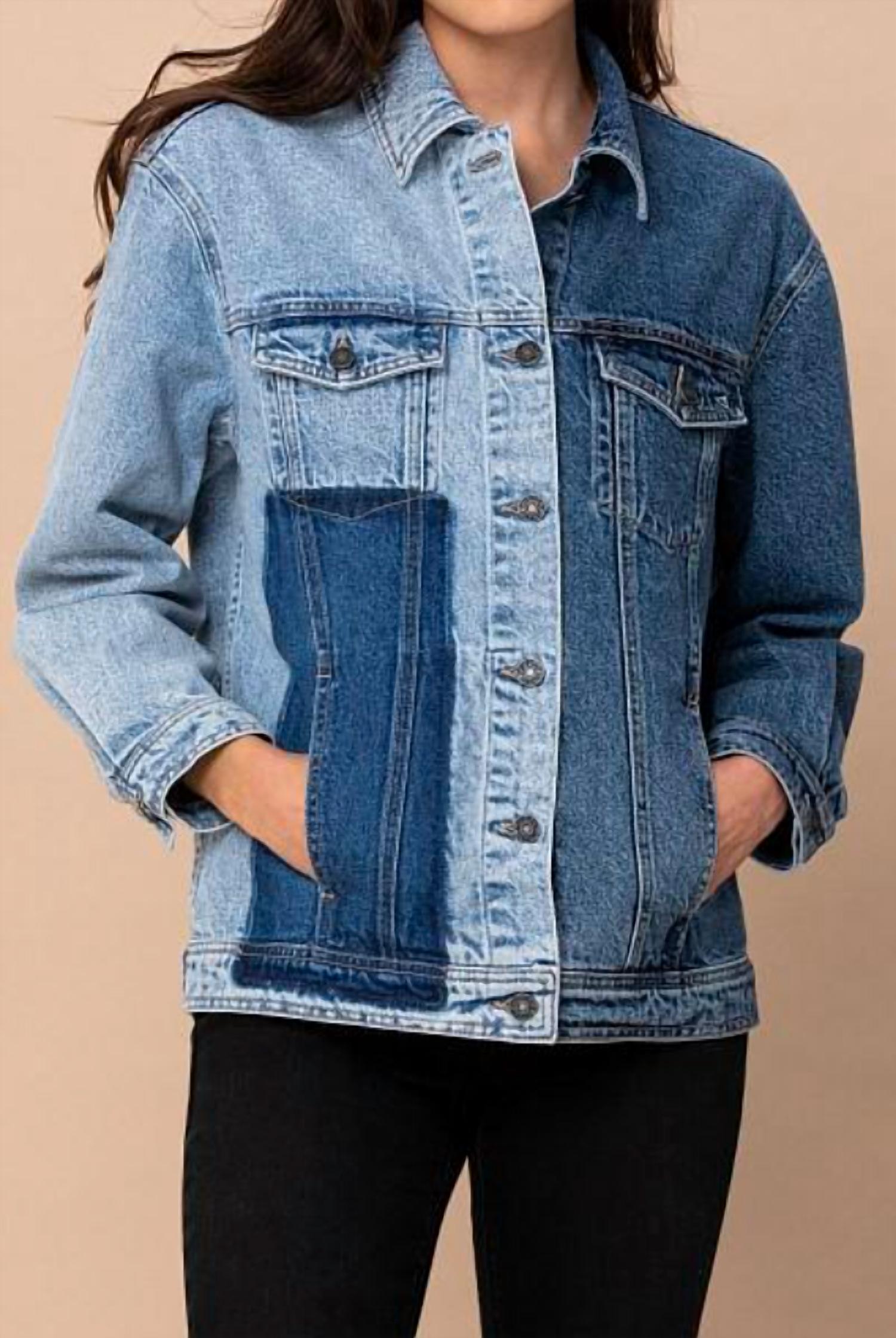 Two tone oversized jean jacket. 100% cotton. Front length: 22". Comfortable fit.