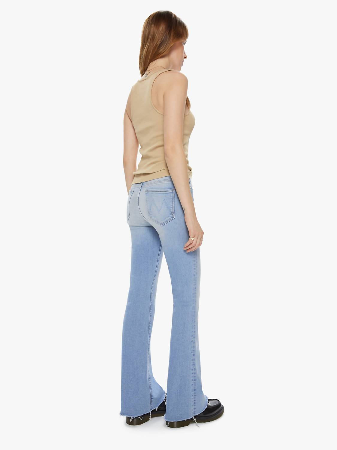 Pair these wide leg jeans with mules, slides or your favorite strappy sandals. Elevate your wardrobe with the Weekender Fray Jeans by Mother, a quintessential mid-rise flare perfect for versatile styling. These light blue California Cruiser jeans feature a 31-inch inseam and a frayed hem, crafted from a cotton blend for a touch of stretch. Made in Los Angeles, they boast a 9.5-inch rise and a 20-inch leg opening. Closure: Button closure. Care: Machine wash, tumble dry. Model is 5'10" and wears size 26 or small bottoms.