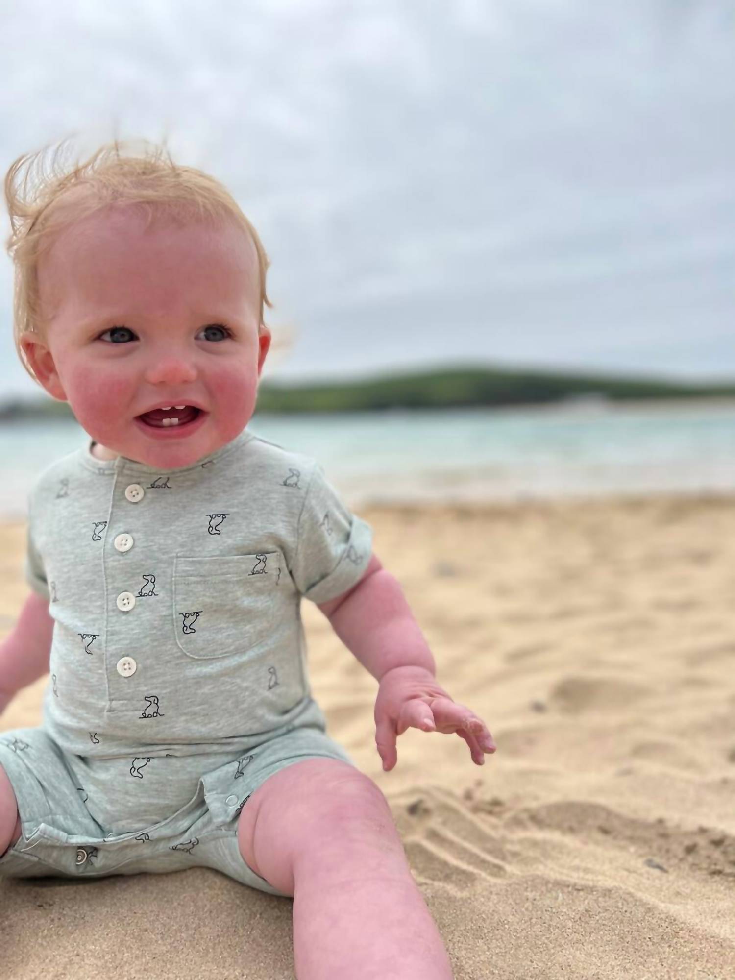 100% Cotton. Footless and short leg. Short sleeves. Buttoned closure neck. Crewneck. Chest pocket. Snap bottom for easy diaper changes..